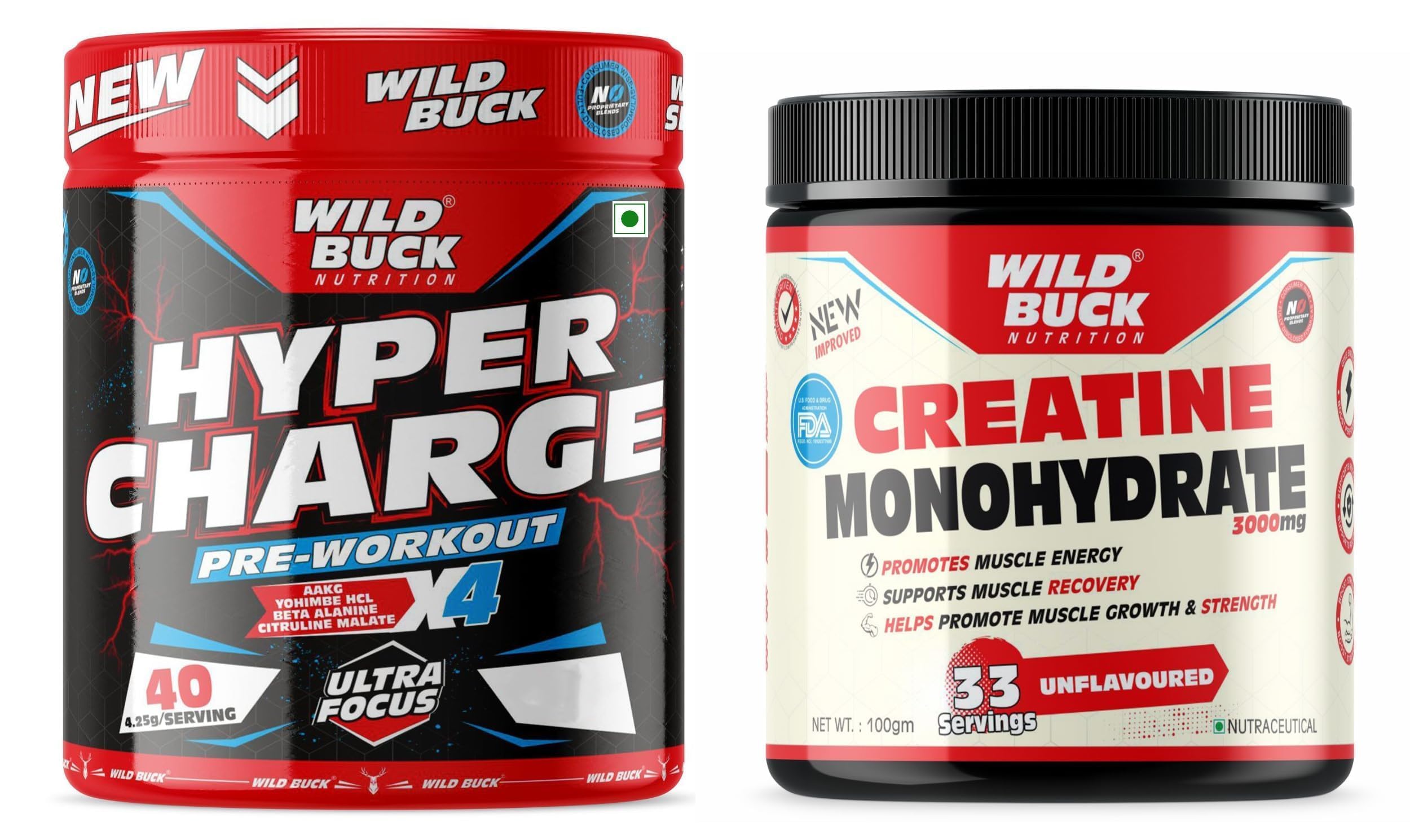 WILD BUCK Hyper Charge Pre-X4 Hardcore Pre-Workout Supplement Powder For Men & Women [40 Serv Watermelon] + Creatine Monohydrate PowderRecovery [33 ServingsUnflavoured]