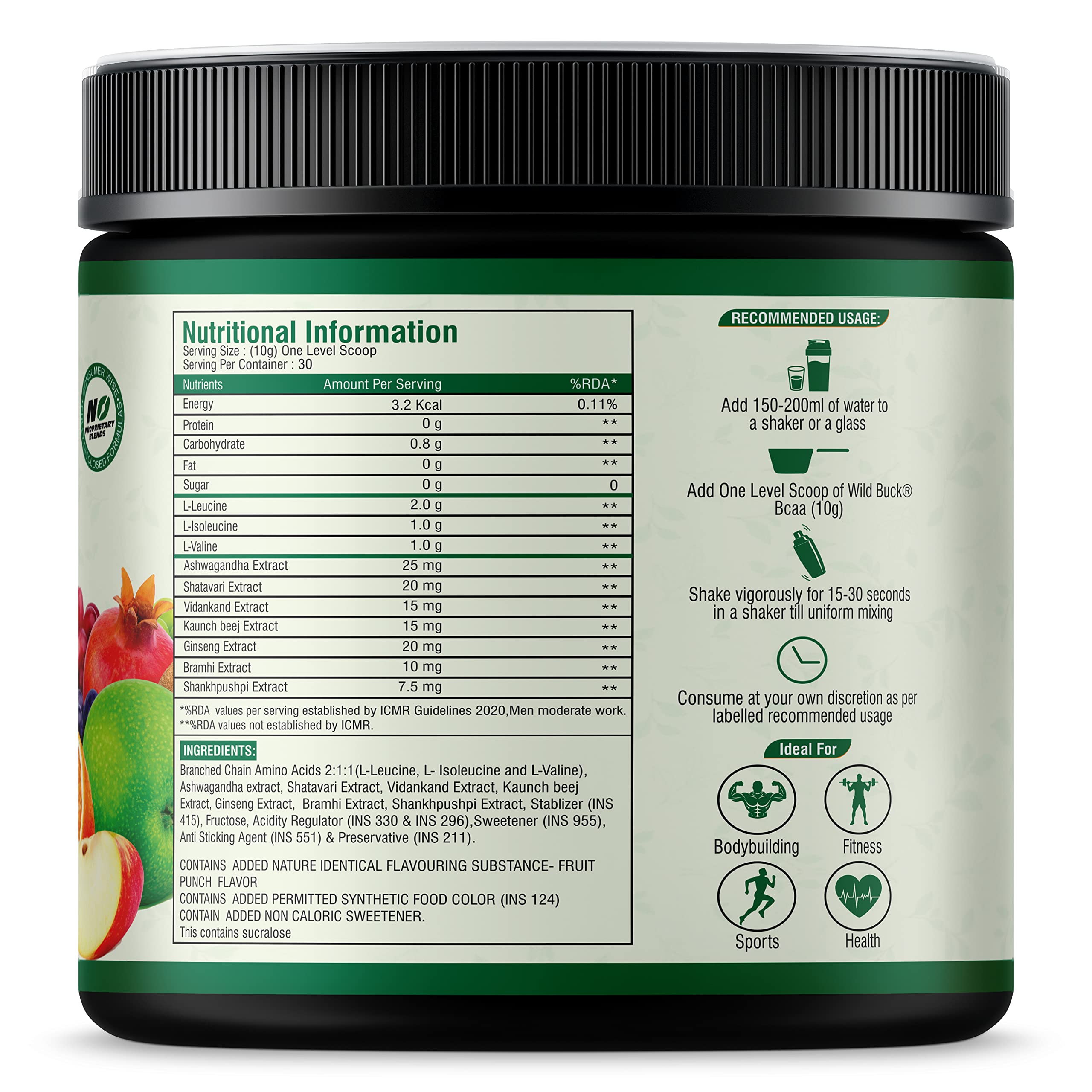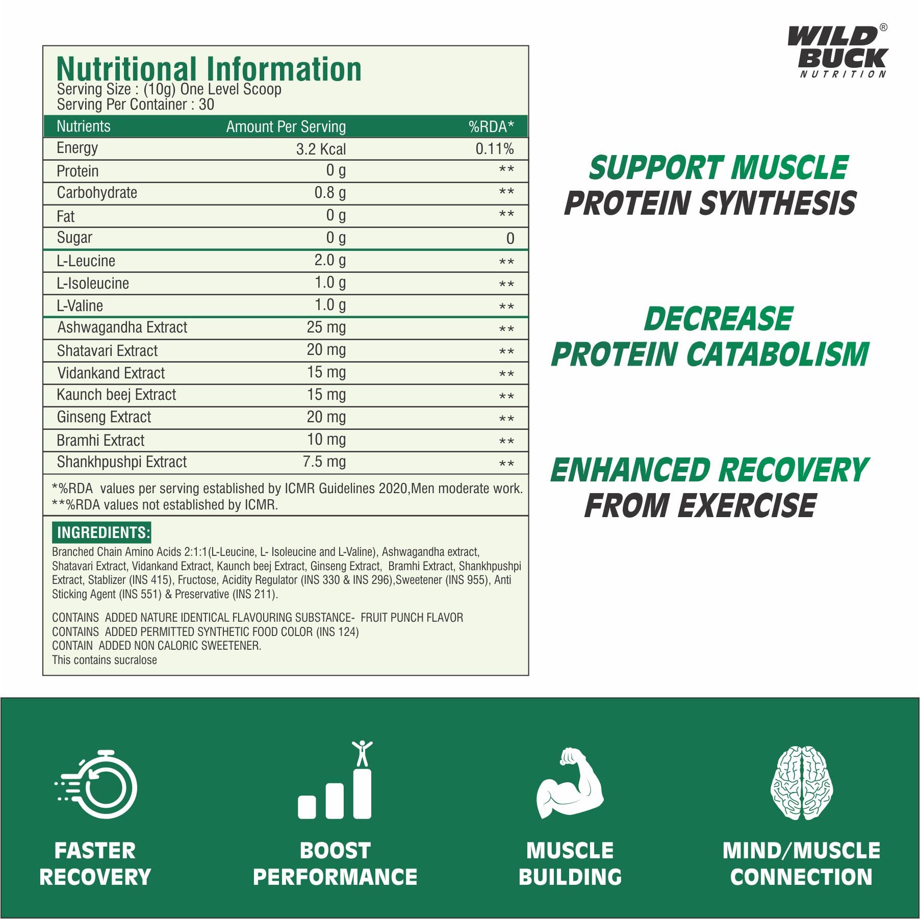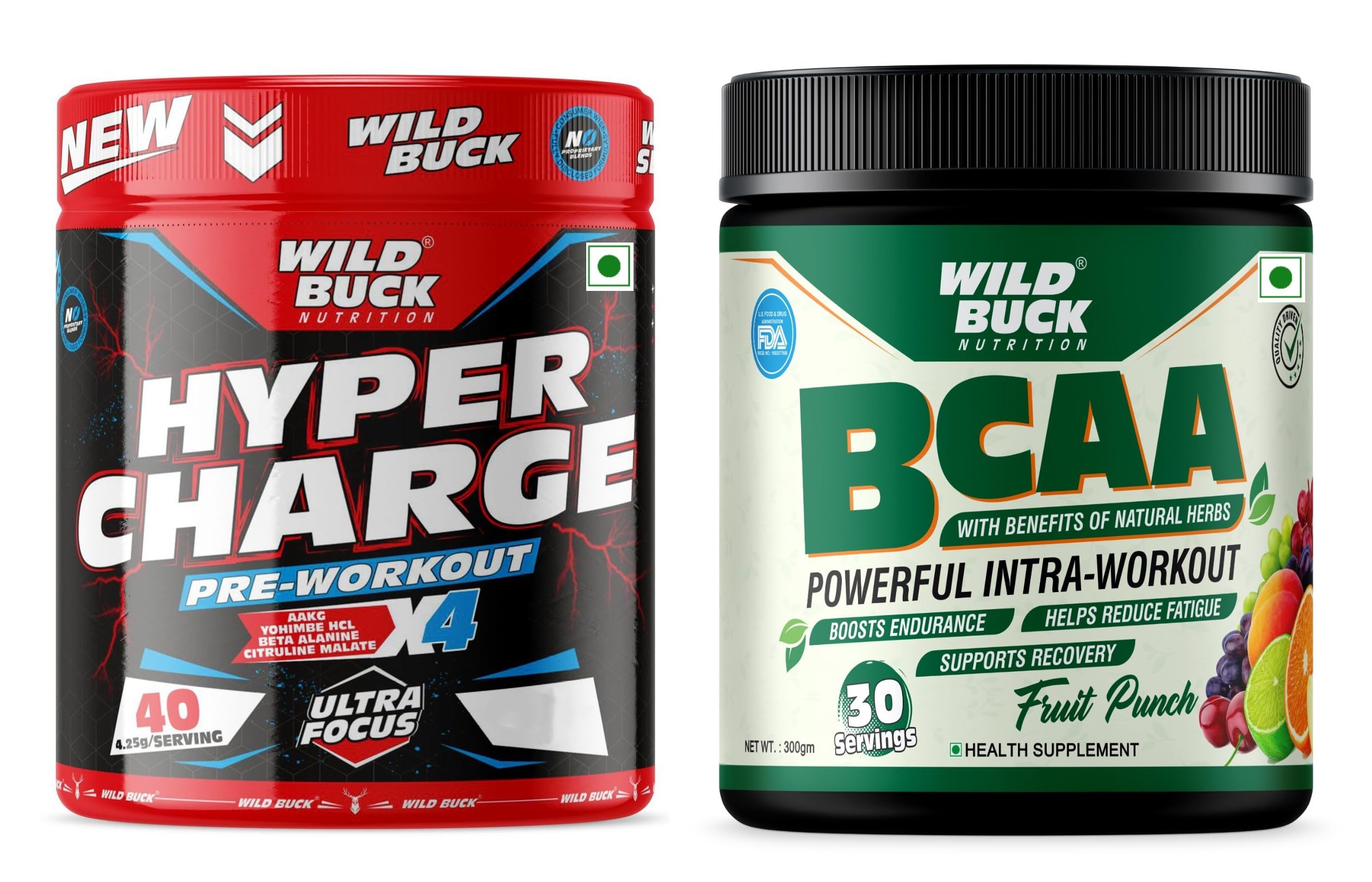 The WILD BUCK Hyper Charge X4 Pre-workout : Designed to elevate your energy focus power output and performance levels it will help you power through every training session and prime you for harder heavier and more productive lifts. With so many ingredients dedicated to powering up your results The WILD BUCK Pre-workout is in a league of its own. Stop leaving gains on the table. Start making the most of your workouts today with The WILD BUCK Pre-workout the lifting partner youâve been looking for. Serving: For Insane Workout - Take One Scoop with 150-200ml of water and drink 10-20 minutes before action. For Hardcore Workout - Take half Scoop with 150-200ml of water and drink 10-20 minutes before action. Wild Buck Nutrition BCAA 2:1:1 is a scientifically formulate supplement that consists of a blend of the best Branched chain amino acids (BCAA's) (L-Leucine L-Isoleucine and L-Valine) with Unique blend of Natural herbs that keep the body fit lean and in shape. It provides complete nutrition of a meal making fat loss and weight management easier. One regular meal gives you adequate nutrition and fewer calories as per recommended daily.