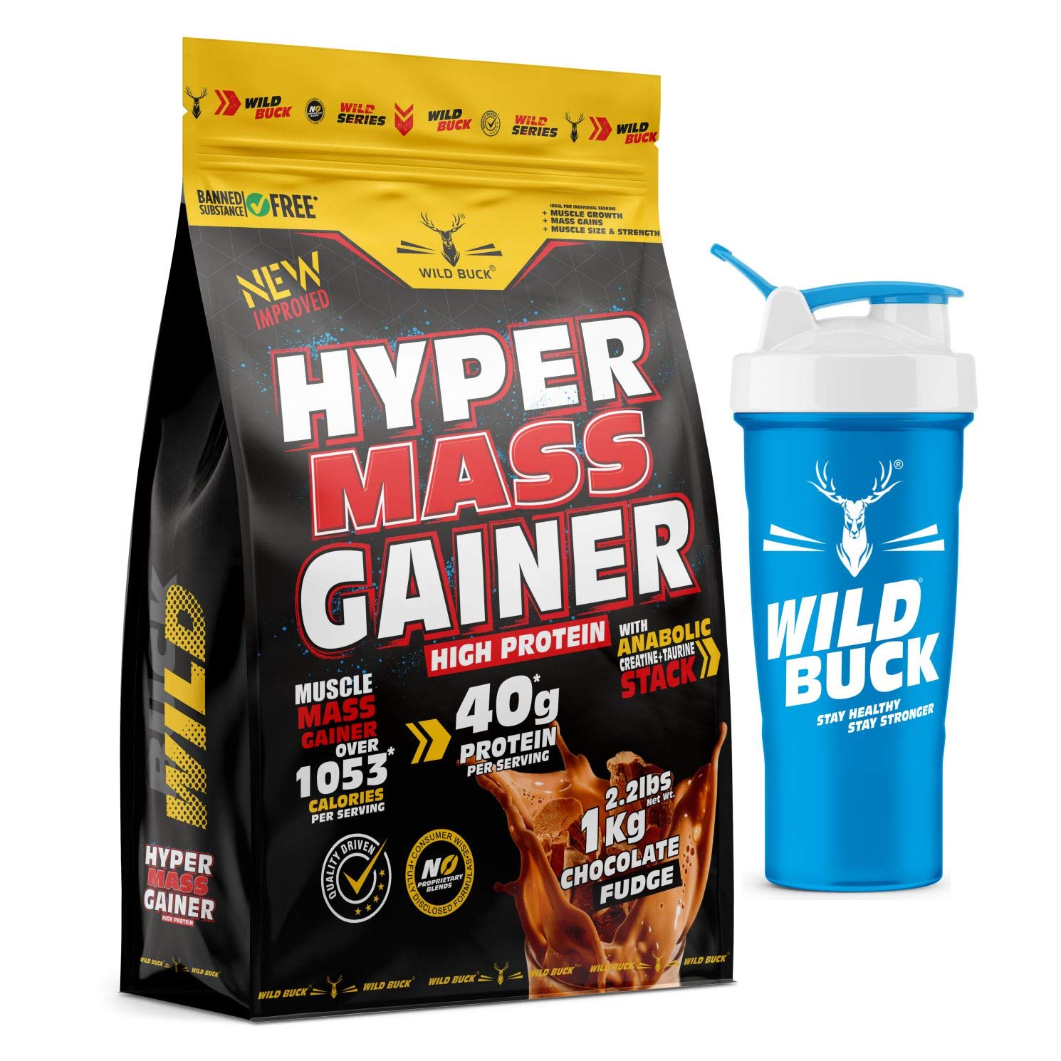 Wild Buck Hyper Mass Gainer High Protein Muscle Mass Gainer with Creatine + Taurine1053 Calories & 40g Protein Gain Strength & Sizefor Men & Women [Chocolate Fudge1 Kg Powder] Free Shaker