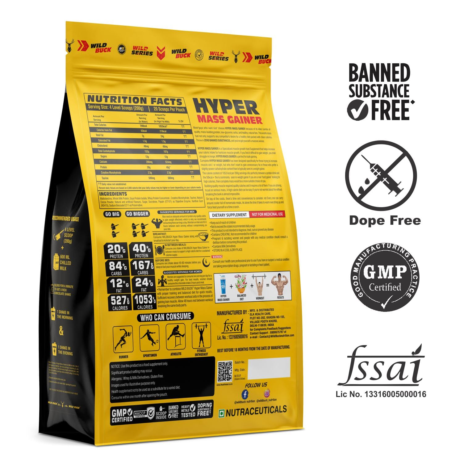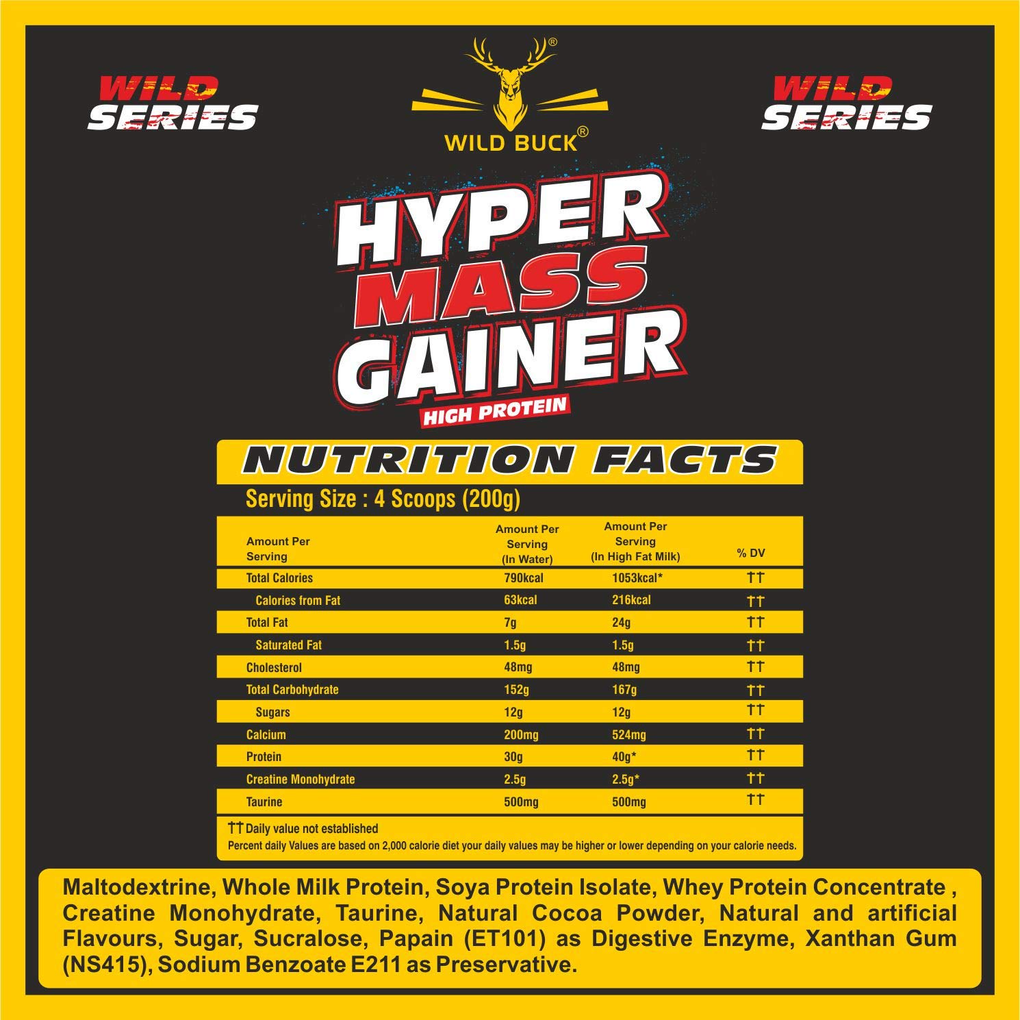 HomeHealth & PersonalDiet & NutritionHealth SupplementsWild Buck Hyper Mass Gainer High Protein Muscle Mass Gainer with Creatine + Taurine1053 Calories & 40g Protein Gain Strength & Sizefor Men & Women [Chocolate Fudge1 Kg Powder] Free Shaker