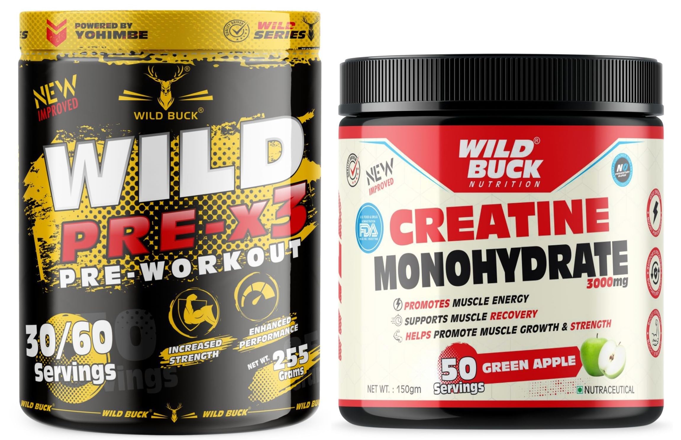 The WILD BUCK Pre-workout : Designed to elevate your energy focus power output and performance levels it will help you power through every training session and prime you for harder heavier and more productive lifts. With so many ingredients dedicated to powering up your results The WILD BUCK Pre-workout is in a league of its own. Stop leaving gains on the table. Start making the most of your workouts today with The WILD BUCK Pre-workout the lifting partner youâve been looking for. Serving: For Insane Workout - Take One Scoop with 150-200ml of water and drink 10-20 minutes before action. For Hardcore Workout - Take half Scoop with 150-200ml of water and drink 10-20 minutes before action. Creatine has become one of the most popular sports supplements among professional and amateur athletes. In the body creatine is converted to creatine phosphate which helps to fuel skeletal muscles and provides support for immediate energy products during high-intensity workouts. Creatine may very well be the single most heavily researched sports supplement available today. Creatine is a key nutrient that occurs naturally in the body and found in some foods. Creatine functions as an energy source in your muscle cells helping to increase strength and reduce fatigue during intense training.