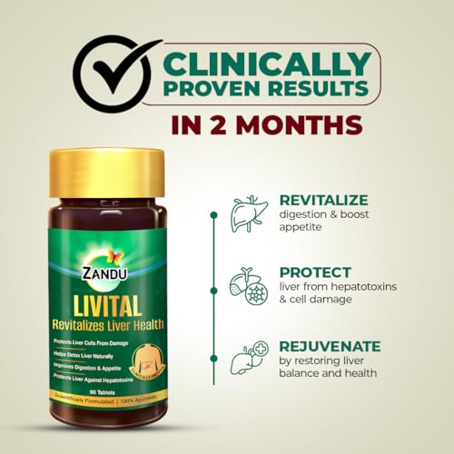 Zandu Livital tablet is a scientifically tested & clinically proven formulation made with harmonious blend of 9 potent Ayurvedic ingredients. These ingredients were selected after careful curation and research by experts in Ayurveda. This formulation includes ingredients like Bhringaraja Guduchi Tamalaki Kalmegh Raktapunarnava Katuka Vidanga Rohitaka & Kasani that are well known for their capacity to cleanse our system expel toxins promote optimal digestion act as a tonic for liver health and helps in management of liver disorders. Additionally these ingredients are renowned for their hepatoprotective immunity-boosting stress-reducing and anti-oxidant properties. Zandu Livital Tablets are clinically proven to produce noticeable improvements in liver health becoming apparent after just two months of use. Livital tablet helps restore your liver's health protect liver cells from damage & detoxifies your liver naturally while enhancing your appetite and digestion. It also provides defense against hepatotoxins for year-long liver protection. These tablets do not have any added artificial flavors or preservatives. It presents a convenient simple and highly effective solution for holistic well-being. Livital tablet can help liver when individuals are engaged in bodybuilding and maintaining high protein intake. Additionally Livital tablets have ayurvedic ingredients that helps reduce damage caused by alcohol. By choosing Livital you are paving the way for a healthier liver and a better tomorrow. The best liver care is provided by these 100% Ayurvedic tablets which have been prepared with your health in mind. Now revitalize your liver health naturally!