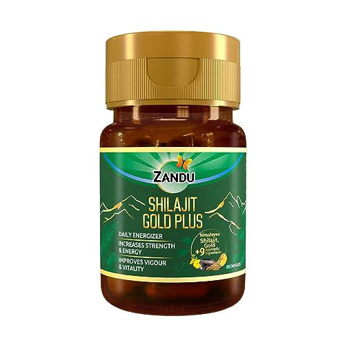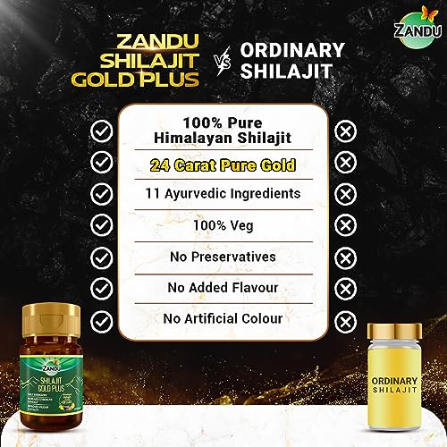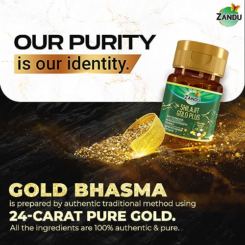 Zandu Shilajit Gold Plus| Scientifically Tested Advanced Formula| Made Using 100% Pure Himalayan Shilajit, Gold & 9 Ayurvedic Herbs |Enhances Strength, Stamina, vigour, Vitality and Power | 20 Caps