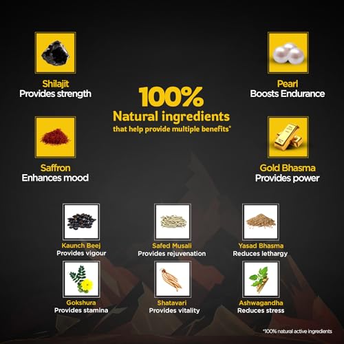 *Daily Energizer. Ayurvedic Capsule. *10 Powerful Ayurvedic Ingredients like Shilajit Gold Saffron Pearl Ashwagandha Kaunch Beej Safed Musali Yasad Bhasma Gokshur & Shatavari *Helps Provide More Energy More Intensity *One Capsule twice a day preferably wi
