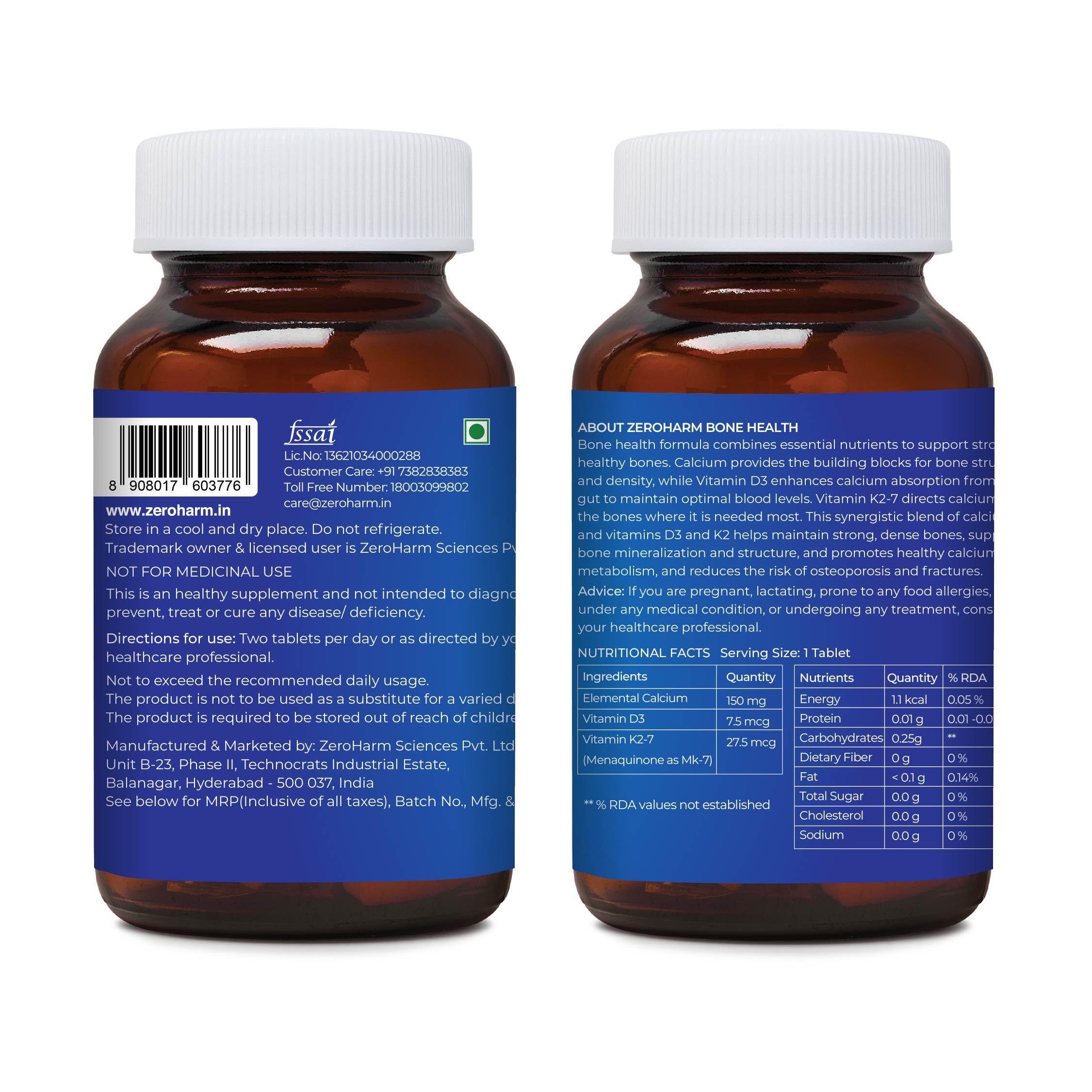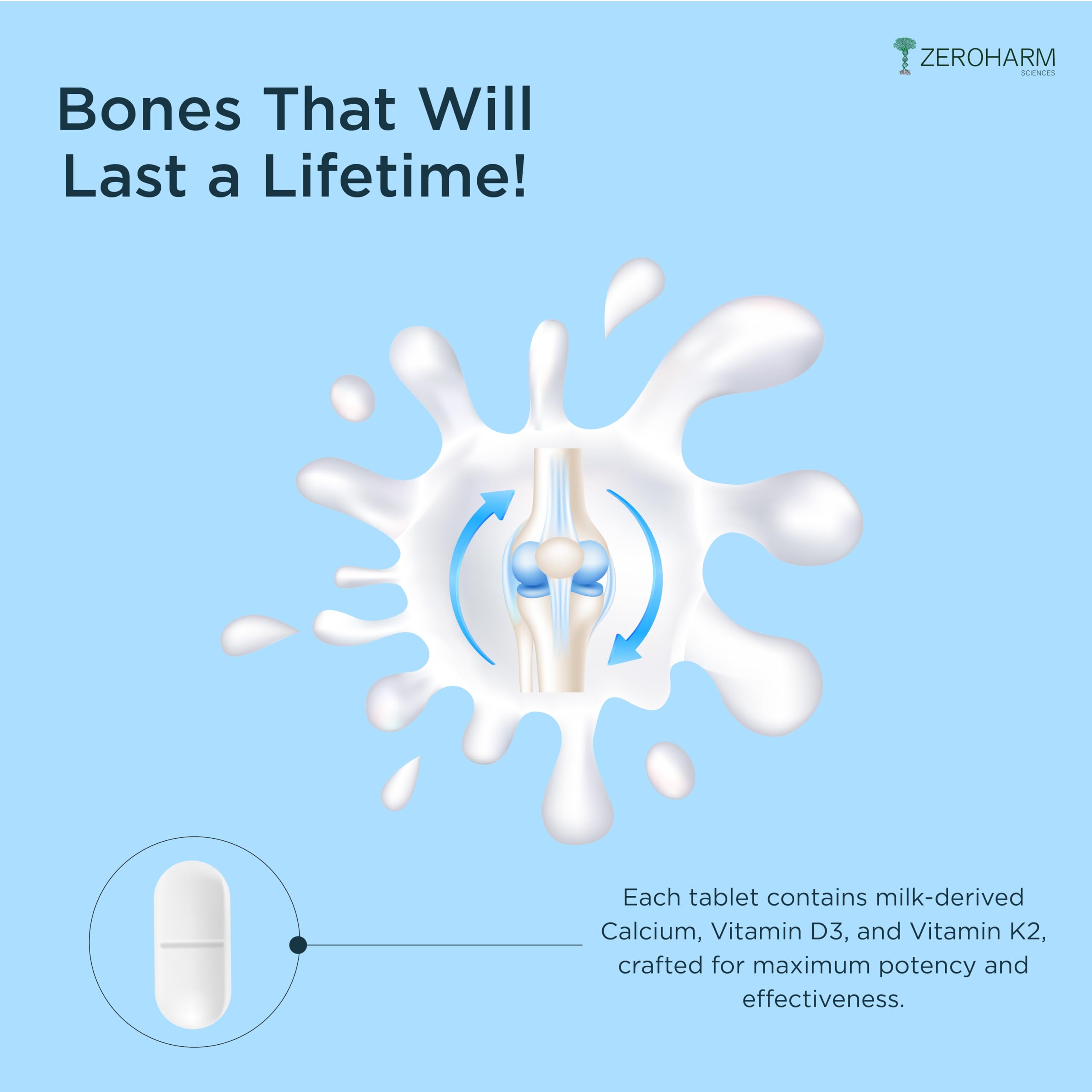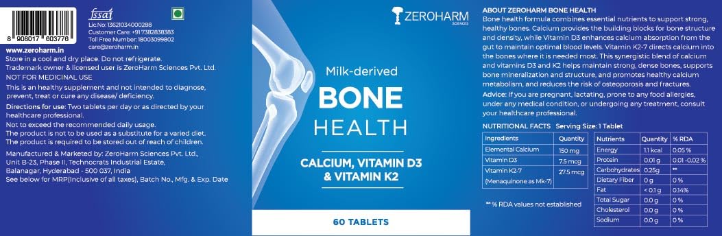 Introducing Bone Health Tablets each tablet contains milk-derived Calcium Vitamin D3 and Vitamin K2 along with magnesium and phosphorus. Supports bone density joint health and muscle strength. Take one tablet after meals twice a day. Experience stronger bones and muscles and improved health.