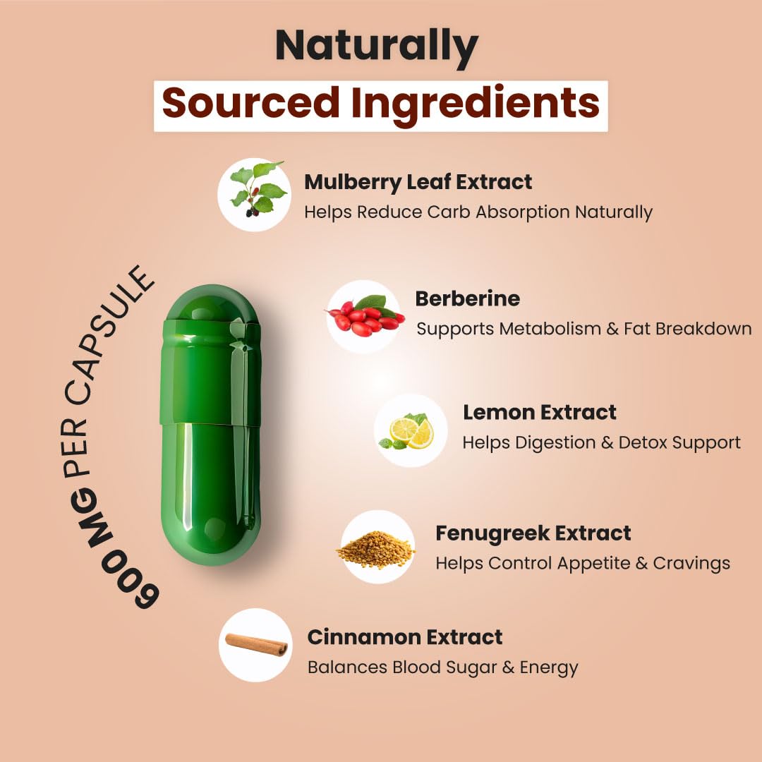 HELPS REDUCE POST-MEAL GLUCOSE SPIKES - Formulated with Mulberry Leaf Extract Berberine Lemon Extract Cinnamon and Fenugreek this advanced blend supports post-meal glucose metabolism and carb absorption balance.Ideal for those seeking a natural carb block