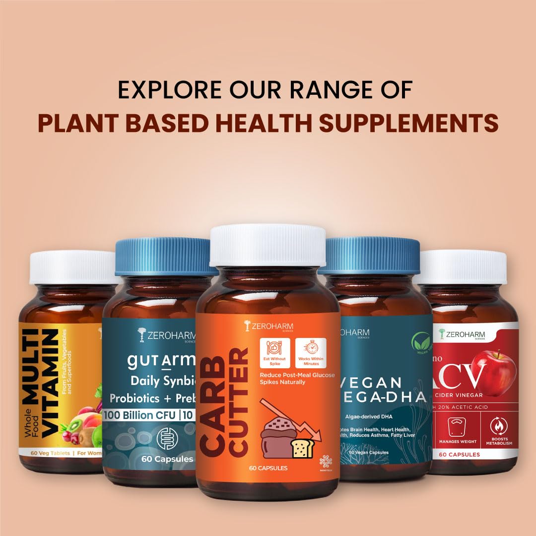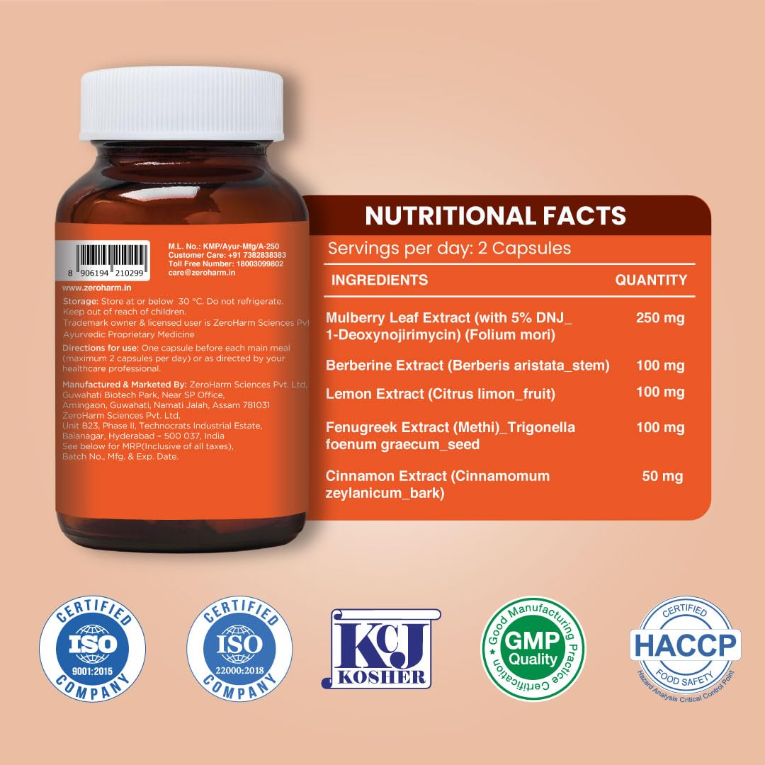 ZEROHARM Carb Cutter With Mulberry Leaf Extract Berberine Fenugreek Lemon & Cinnamon for Post-Meal Glucose & Metabolism Support - 100% Plant-based Supplement for MenWomen - 60 Capsules