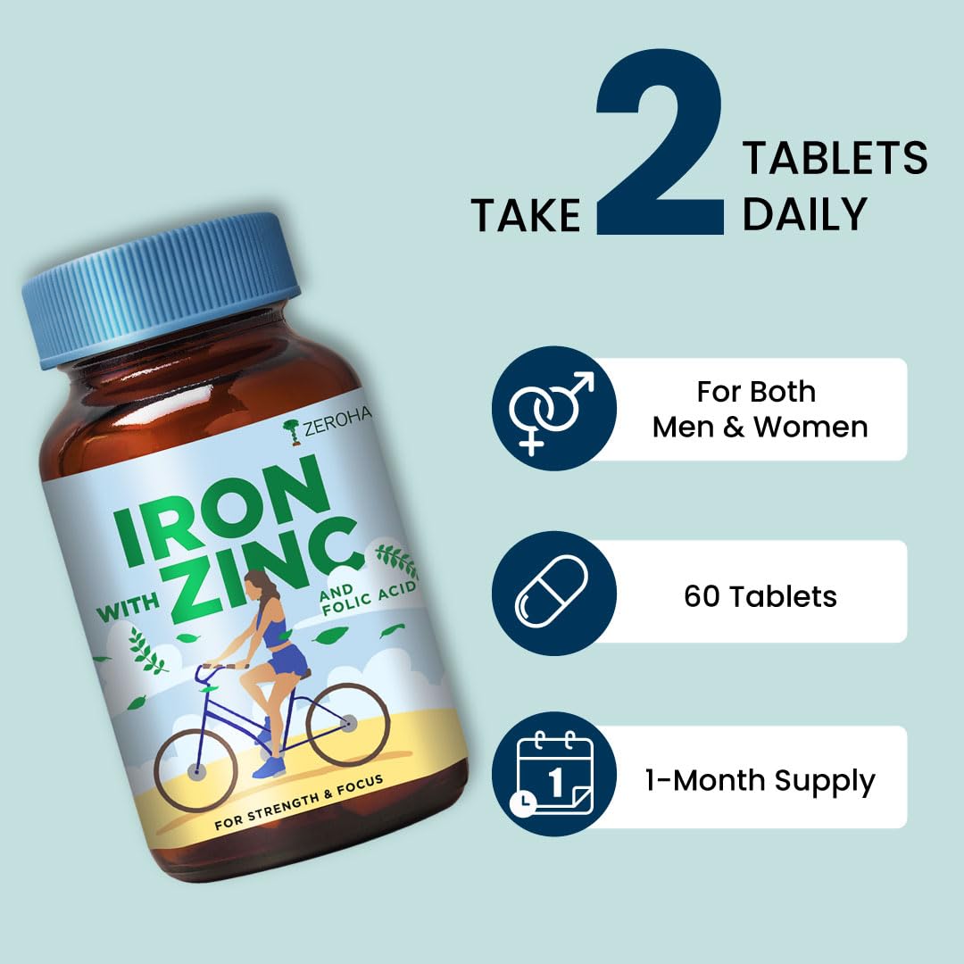 HomeHealth & PersonalDiet & NutritionHealth SupplementsZEROHARM Iron Zinc Folic Acid & B12 Tablets - Nano Formulated for High Absorption - Energy Immunity Skin Hair & Daily Wellness Support - Plant Based Supplement for Men Women - 60 Tablets - 2 Pack