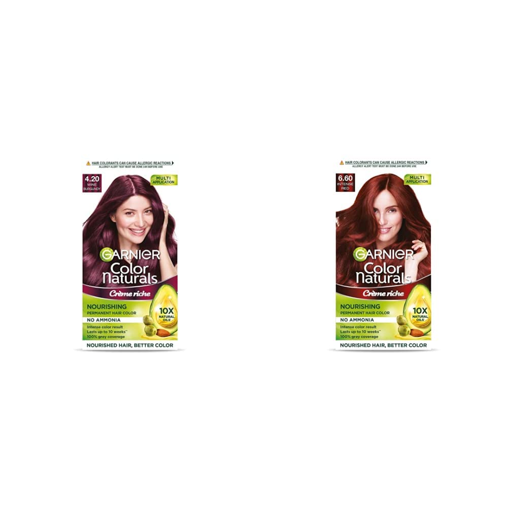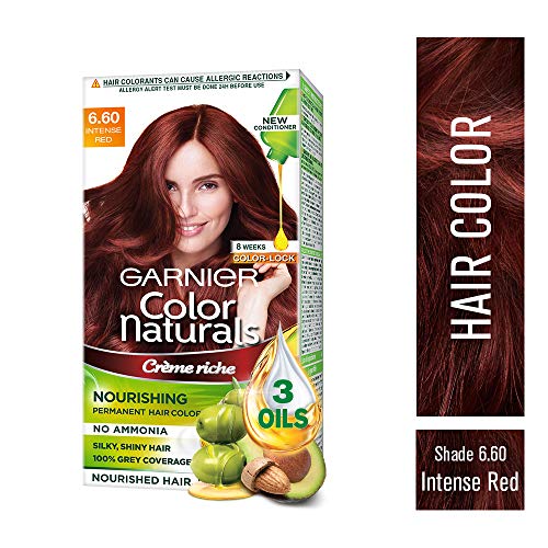 Garnier Color Naturals Cr¨me hair color Shade 4.20 Wine Burgundy 70ml, + 60gGarnier Color Naturals is cr¨me hair colour which gives 100% Grey Coverage and beautiful rich color. It is an ammonia free hair color and has a superior Colour Lock technology which gives you rich long lasting color that lasts upto 8 weeks. Color Naturals comes in a range of 8 gorgeous shades especially suited for Indian skin tones. It is available in an easy to use kit which can be used at your convenience in the comfort of your house! It is enriched with the goodness of 3 oils â Almond Olive and Avocado which nourishes hair and provides shiny long lasting colour. Your Hair will love the nourishment and you will love the colour! To use mix equal parts of the colorant and the developer in a plastic or a glass bowl and apply the mixture to your hair with a brush on dry unwashed hair. Leave on for 30 minutes and rinse with water. Apply post colour-care conditioner (provided in kit) to the hair and rinse to reveal shiny rich hair color. Post Colour Care: We recommend using a colour protect shampoo and conditioner for long lasting colour. Note: Always do a skin allergy test 24 hours before use.Garnier Color Naturals Cr¨me hair color Shade 6.60 Intense Red 70ml, + 60gGarnier Color Naturals is cr¨me hair colour which gives 100% Grey Coverage and beautiful rich color. It is an ammonia free hair color and has a superior Colour Lock technology which gives you rich long lasting color that lasts upto 8 weeks. Color Naturals comes in a range of 8 gorgeous shades especially suited for Indian skin tones. It is available in an easy to use kit which can be used at your convenience in the comfort of your house! It is enriched with the goodness of 3 oils â Almond Olive and Avocado which nourishes hair and provides shiny long lasting colour. Your Hair will love the nourishment and you will love the colour! To use mix equal parts of the colorant and the developer in a plastic or a glass bowl and apply the mixture to your hair with a brush on dry unwashed hair. Leave on for 30 minutes and rinse with water. Apply post colour-care conditioner (provided in kit) to the hair and rinse to reveal shiny rich hair color. Post Colour Care: We recommend using a colour protect shampoo and conditioner for long lasting colour. Note: Always do a skin allergy test 24 hours before use.