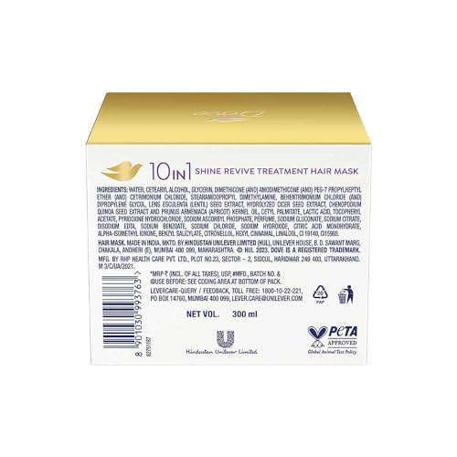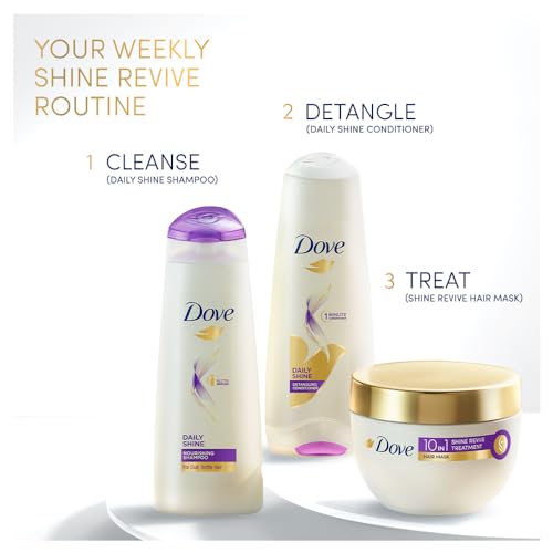Your hair has been your steadfast companion enduring the scorching heat the pollution from the everyday commute and the effects of the environment. Yet it has embraced all of this for its ultimate wish is to see you revel in the happiness that comes from caring for hair that feels healthy. Dove realises your hair needs more. Multiple factors including chemical exposure stress and fluctuations in weather conditions can lead to dullness unwanted frizz tangled hair & split ends. Restoring hair's shine requires repairing years of hair damage. Introducing Dove's Shine Revive Treatment Hair Mask infused with Vitamins B6 C & E. The smoothening formula of this hair mask for dull frizzy hair penetrates deep into each hair strand revitalizes lost shine that lasts for up to 72 hours*. Your hair regains its shine and feels silky to the touch. Consider it as revitalizing hair shine treatment nourishing your hair like your in-home hair spa session. It's free from sulphates & parabens and proudly sports a PETA-certified cruelty-free badge. For a weekly rejuvenation apply this creamy smoothening mask on clean damp hair. Let it sit for 5 minutes allowing the mask to work its wonders then rinse thoroughly. For best results use Dove hair Mask along with Dove's Daily Shine Shampoo & Conditioner. Witness your hair's transformation growing shinier and healthier with every use.