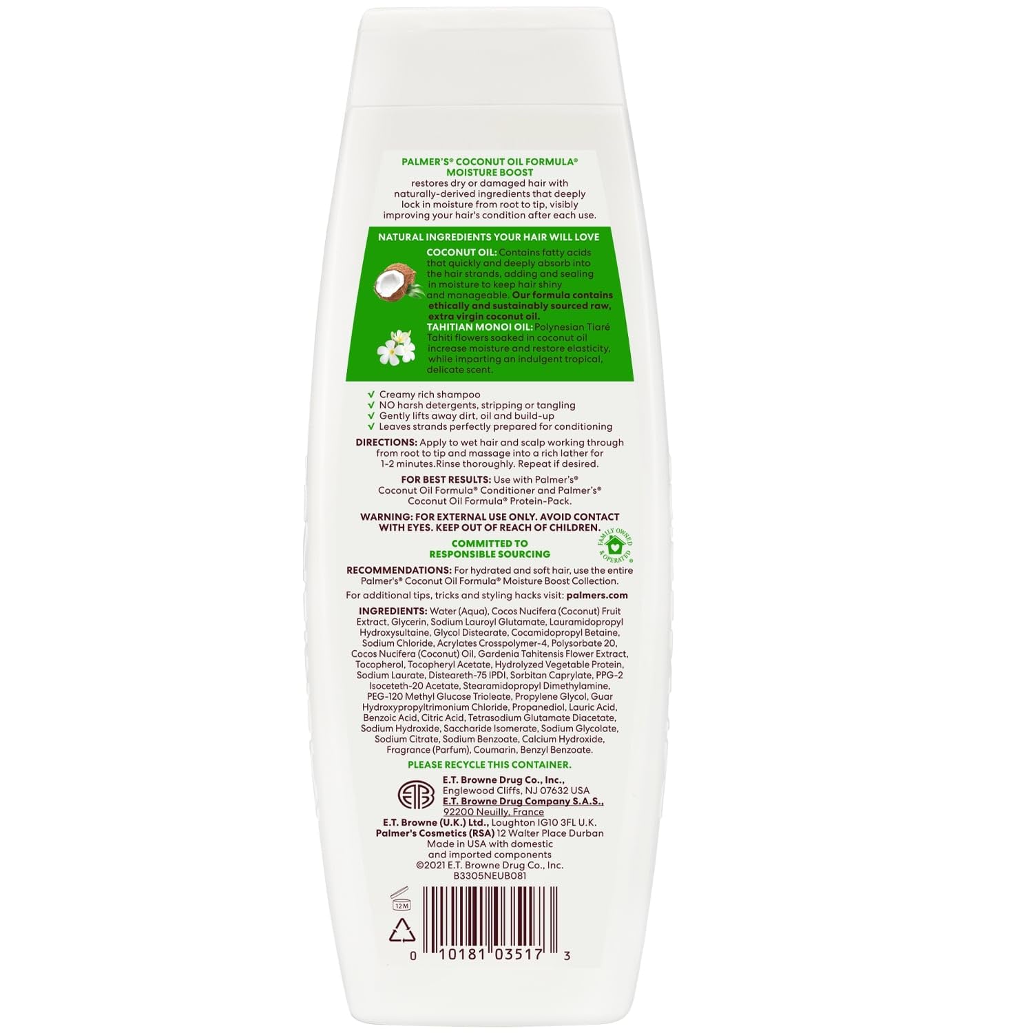 Plamers coconut oil formula conditioning shampoo palmers coconut oil formula conditioning shampoo a rich creamy shampoo gently cleanses and removes buildup without stripg hair or interrupting its moisture balance. Free of harsh detergents this sulfate-free formula of pure coconut oil keratin and vitamin e infuses hair with natural moisturizers and essential nutrients to help repair damage and give hair incredible shine