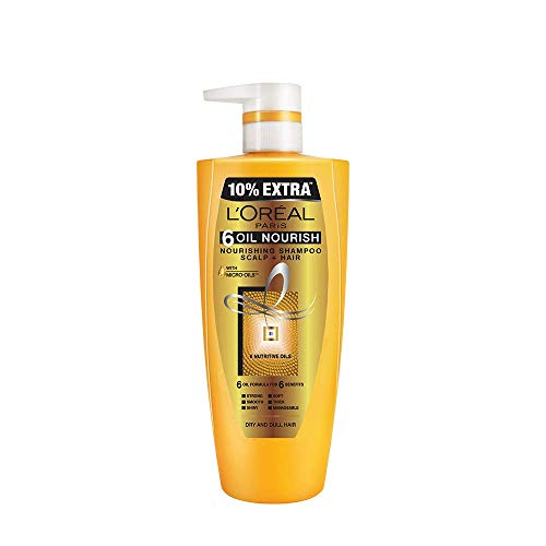 The 6 Oil Nourish Shampoo has been created to provide complete nourishment to your hair from root to tip with 6 Micro Oils making it soft shiny thick strong smooth and manageable.Science meets tradition with the infusion of 6 unique oils. The L'Oreal Paris 6 Oil Nourish Shampoo has been specially created by the L'Or al Research & Innovation Centre in India. It penetrates deep into the scalp giving it utmost nourishment and care that is suitable for all hair types.This shampoo comes with 6 Micro Oils to make your hair soft strong thick smooth shiny and manageable. Suitable for all hair types this shampoo penetrates into your scalp to make your hair beautiful.The 6 oil nourish shampoo has been created to provide complete nourishment to your hair from root to tip with 6 micro oils making it soft shiny thick strong smooth and manageable Science meets tradition with the infusion of 6 unique oils Massage gently into wet scalp/hair lather and rinse for soft nourished and healthy hair.