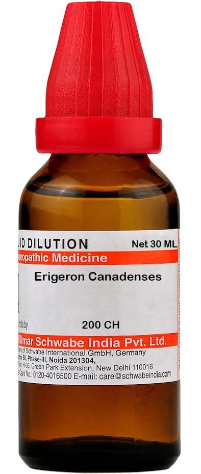 Dr Willmar Schwabe India Erigeron Canadenses Dilution helps to reduce the roughness of pharynx and sensation as if something had lodged in the upper part of the oesophagus is relieved with Erigeron Severe neuralgia in anus with tenesmus haemorrhage from the bowels.