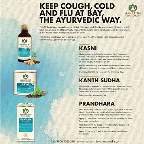 Maharishi Ayurveda Ayurvedic Remedy Kit with Tulsi Cinnamon Pippali Ginger Cinnamon Oil Ginger Black pepper and MoreKasni: 50 mlPrandhara: 3mlKanth Sudha: 30 pastilles (Pack 1)