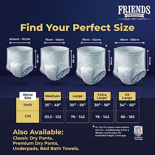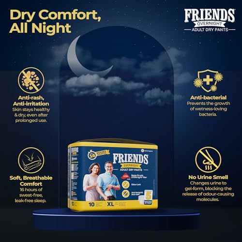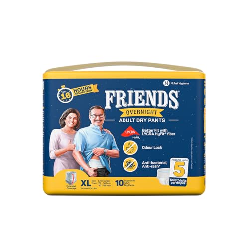 Friends Overnight Adult Diapers Pants Style - 10 Count (Extra Large) with odour lock, Unisex, Leakproof, Elastic Waist and Anti-Bacterial Absorbent Core - Waist Size 30-56 Inch; 76-142 cm