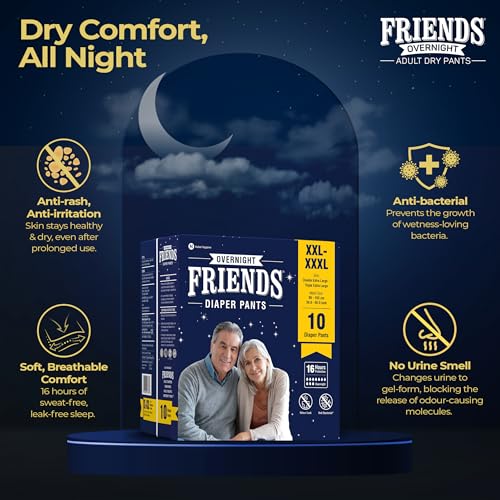 Friends Overnight Adult Diapers Pants Style - 40 Count (Double Extra Large) with odour lock, Unisex, Leakproof, Elastic Waist and Anti-Bacterial Absorbent Core - Waist Size 34-65 Inch; 86-165 cm