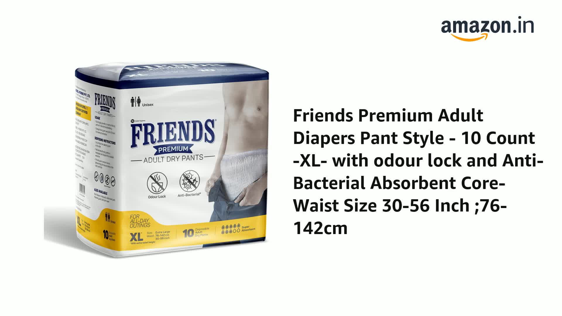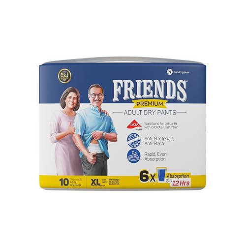 Friends Premium Adult Diapers Pants Style - 10 Count (Extra Large) with odour lock, Unisex, Leakproof, Elastic Waist and Anti-Bacterial Absorbent Core - Waist Size 30-56 inch; 76-142 cm