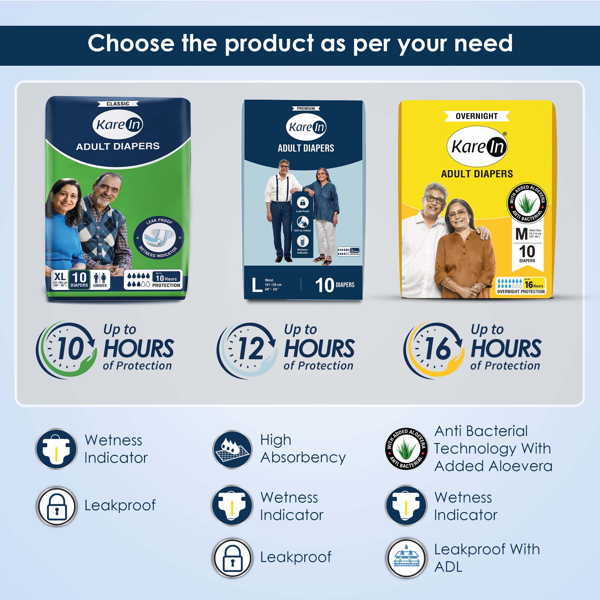 KareIn Classic Adult Diapers Extra Large Waist Size 127-165 Cm (50"-65") 10 Count Tape Style Unisex High Absorbency Leak Proof Wetness Indicator