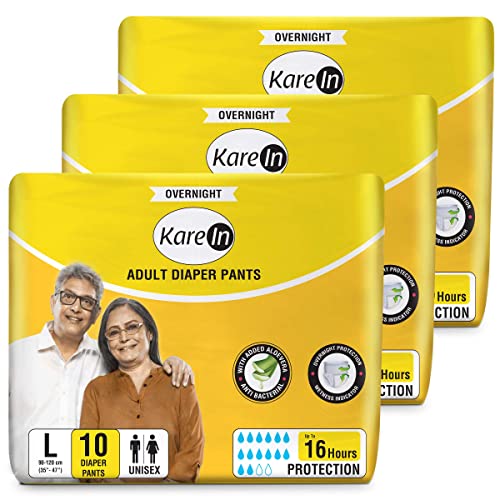 KareIn Overnight Adult Diaper Pants, Large 90-120 Cm (35"- 47"), 30 Count, Unisex, Leakproof, Elastic Waist, With Aloe Vera Lotion, Anti-Bacterial, ADL, Wetness Indicator, Pack of 3