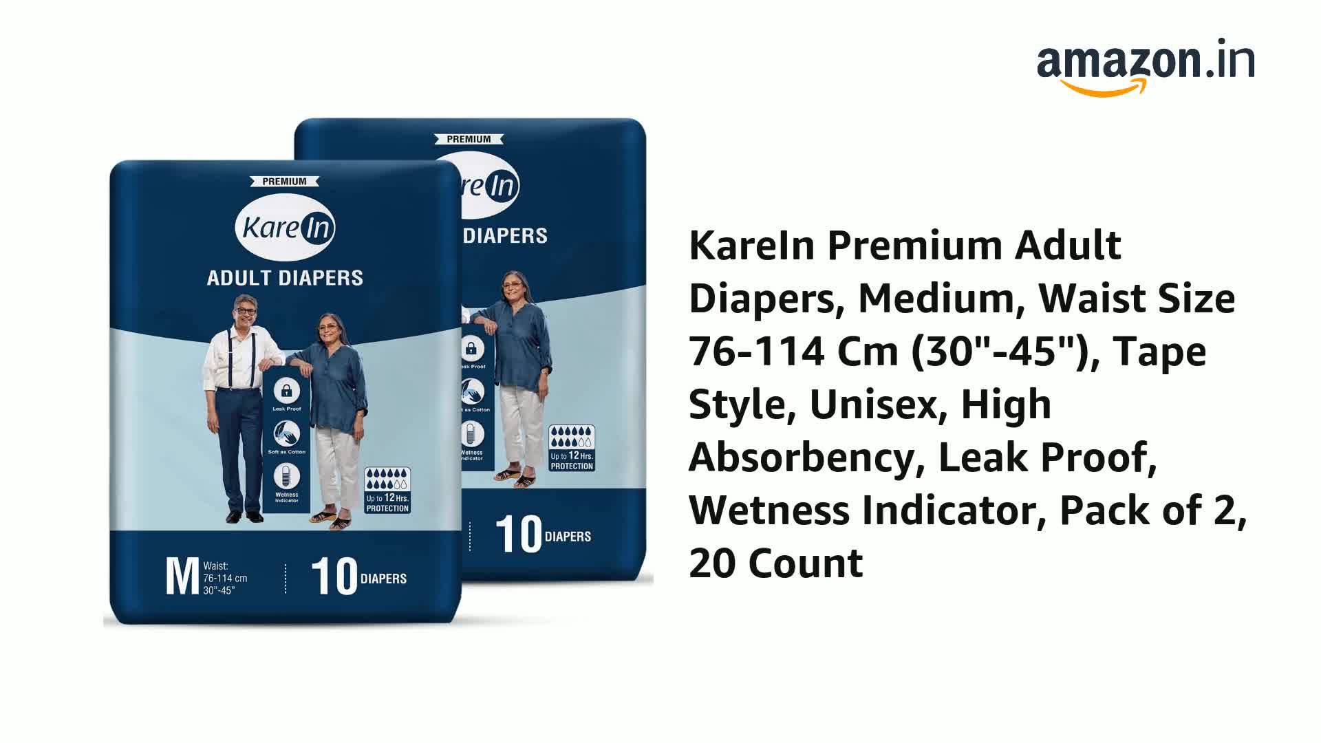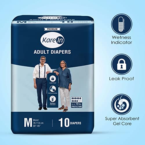 KareIn Premium Adult Diapers, Medium, Waist Size 76-114 Cm (30"-45"), 20 Count, Tape Style, Unisex, High Absorbency, Leak Proof, Wetness Indicator, Pack of 2