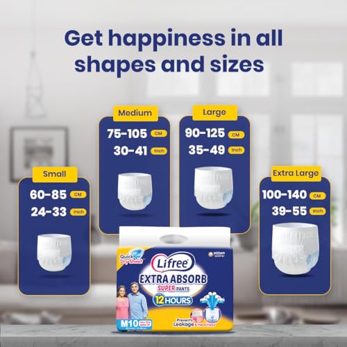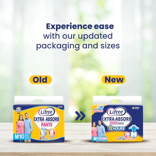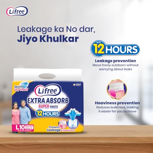 Lifree Extra Absorb Super Pants|Unisex Adult Diaper|Pant Style|Use Upto 12 Hours|6-Glass Absorption|Quick Dry Sheet|Prevents Leakage|Prevents Heaviness|Size L( 35-49 Inches/90-125 Cms)|Count 10