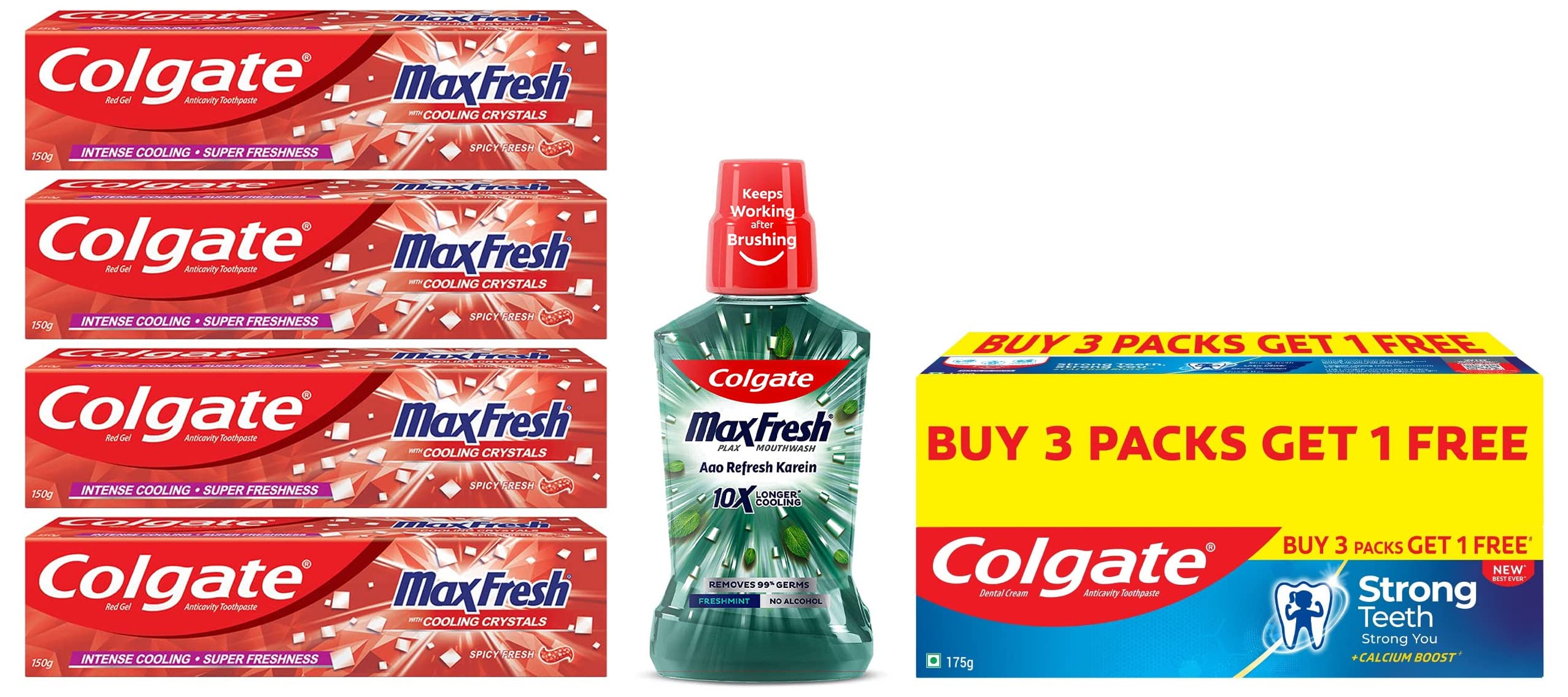 Colgate Plax Fresh Mint Mouthwash 0% Alcohol - 500 mlMouthwashColgate Strong Teeth Cavity Protection Toothpaste Colgate Toothpaste with Calcium Boost 700gm Saver Pack India's No.1 ToothpasteDaant strong toh aap strong! Strong teeth chew better which leads to better absorption of nutrients making you stronger! Natural Calcium gets depleted while eating. Colgate Strong Teeth has a unique Calcium Boost formula which restores Calcium levels making your teeth 2x stronger. Colgate Strong Teeth toothpaste helps prevent cavities whitens teeth and freshens breath with regular use. This toothpaste is safe to use on kids and adults. Recommended Usage: Take pea size drop of toothpaste on a toothbrush and brush your teeth in circular motions or up and down for 2 mins twice a day. Can be used by Men women and children. Colgate is India's most trusted oral care brand. As a trusted partner we are committed to doing business with integrity and respect for all people and the world around you. Colgate offers quality oral care products including toothpastes toothbrushes and mouthwashes as well as expert dental health information. This toothpaste is 100% vegan and gluten-free. We care about our environment Colgate India is the nation's first to earn TRUE Zero Waste Platinum certification for all its four manufacturing sites in India from Green Business Certification Inc. (GBCI). This toothpaste is made in India with the highest quality standards.Colgate Max Fresh Bad Breath Treatment Toothpaste Red Gel Paste With Menthol For Super Fresh Breath 600g 150g X 4 Spicy FreshRefresh with Colgate Maxfresh toothpaste and seize your day because every day is a fresh start. The red gel toothpaste contains unique cooling crystals that give you an intense cooling while you brush and helps get rid of bad breath. Colgate is India's most trusted oral care brand. As a trusted partner we are committed to doing business with integrity and respect for all people and the world around you. Colgate offers quality oral care products including toothpastes and toothbrushesas well as expert dental health information. This toothpaste is 100% vegan and gluten free. We care about our environment Colgate India is the nation's first to earn True Zero Waste Platinum certification for all its four manufacturing sites in India from Green Business Certification Inc. (GBCI). This toothpaste is made in India with highest quality standards.