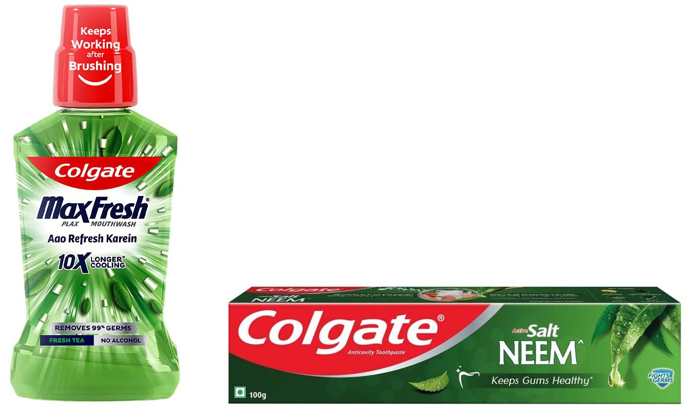 HomeHealth & PersonalPersonal CareOral CareColgate Plax Mouthwash - Pack of 250ml (Fresh Tea) & Colgate Active Salt Neem Toothpaste Germ Fighting Toothpaste for Healthy Tight GumsOral care 100g