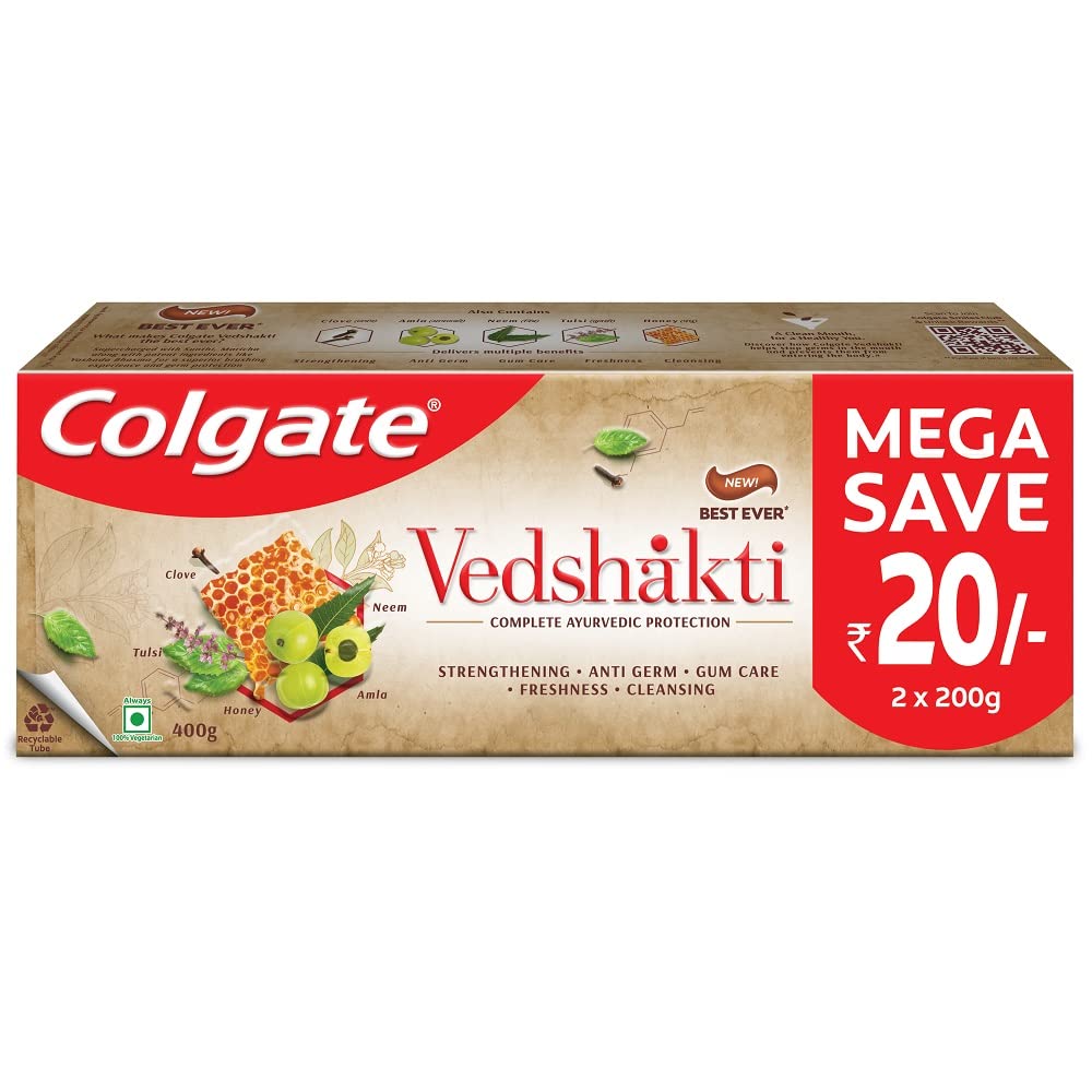 Colgate Strong Teeth Cavity Protection Toothpaste Colgate Toothpaste with Calcium Boost 500gm Saver Pack India's No.1 ToothpasteDaant strong toh aap strong! Strong teeth chew better which leads to better absorption of nutrients making you stronger! Natural Calcium gets depleted while eating. Colgate Strong Teeth has a unique Calcium Boost formula which restores Calcium levels making your teeth 2x stronger. Colgate Strong Teeth toothpaste helps prevent cavities whitens teeth and freshens breath with regular use. This toothpaste is safe to use on kids and adults. Recommended Usage: Take pea size drop of toothpaste on a toothbrush and brush your teeth in circular motions or up and down for 2 mins twice a day. Can be used by Men women and children. Colgate is India's most trusted oral care brand. As a trusted partner we are committed to doing business with integrity and respect for all people and the world around you. Colgate offers quality oral care products including toothpastes toothbrushes and mouthwashes as well as expert dental health information. This toothpaste is 100% vegan and gluten-free. We care about our environment Colgate India is the nation's first to earn TRUE Zero Waste Platinum certification for all its four manufacturing sites in India from Green Business Certification Inc. (GBCI). This toothpaste is made in India with the highest quality standards.Colgate Swarna Vedshakti Ayurvedic Cavity Protection Bad Breath Treatment Toothpaste - 400gmA Clean Mouth means a Healthy You. Your mouth is a host to germs. These germs can enter your body and increase risk of serious diseases such as Diabetes Heart Attack Respiratory Problems Gastrointestinal Diseases Alzheimer's. Colgate Swarna Vedshakti fights germs in the mouth itself and helps stop germs from entering the body. Its unique formula has been created with 5 Ayurvedic ingredients: Neem known to have gum care benefits Clove known for strengthening Amla known for its anti-ger properties Tulsi for freshness & Honey for gum massage. Colgate is India's Most Trusted oral care brand and is certified by Indian Dental Association. This toothpaste is 100% vegetarian and Gluten free. This toothpaste is made in India in our manufacturing unit that is awarded with True Zero Waste Platinum Certification.