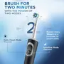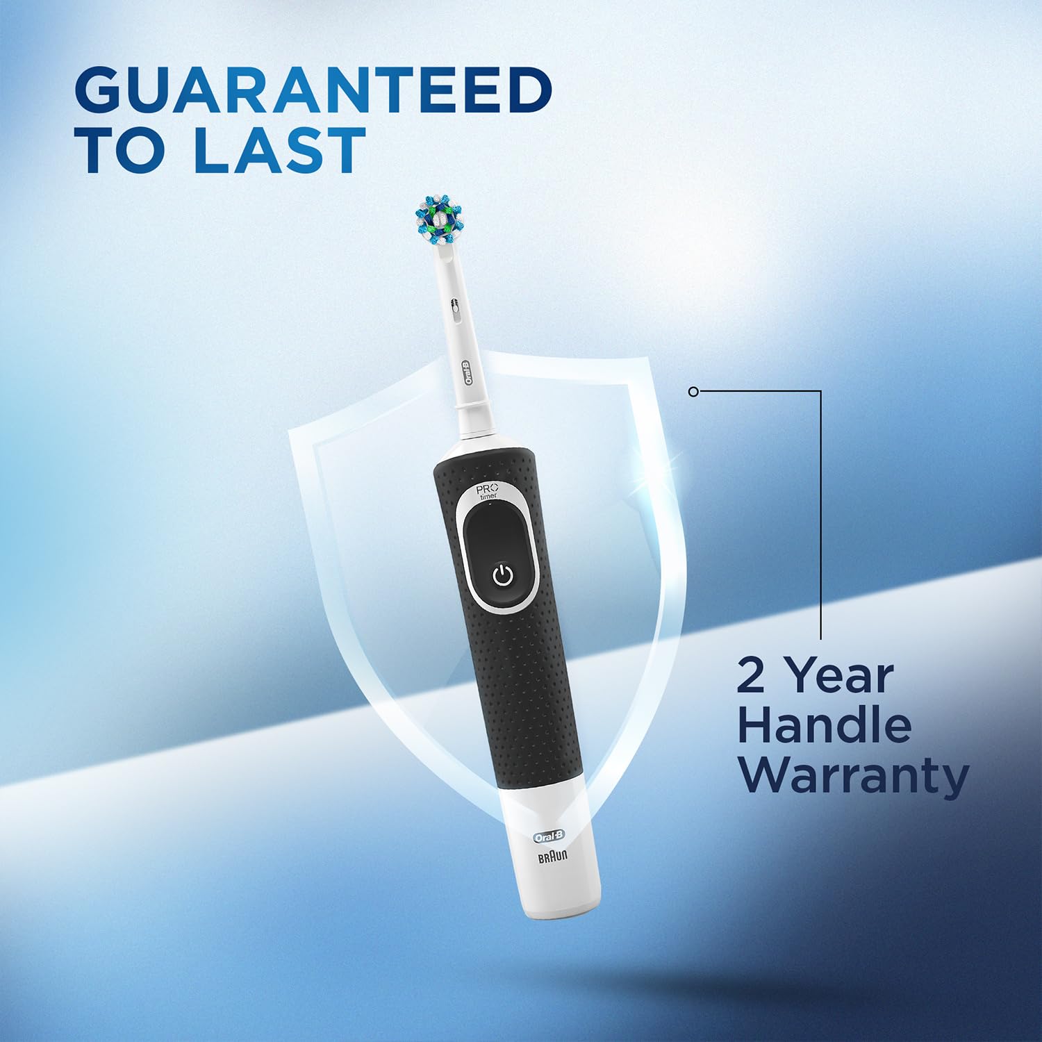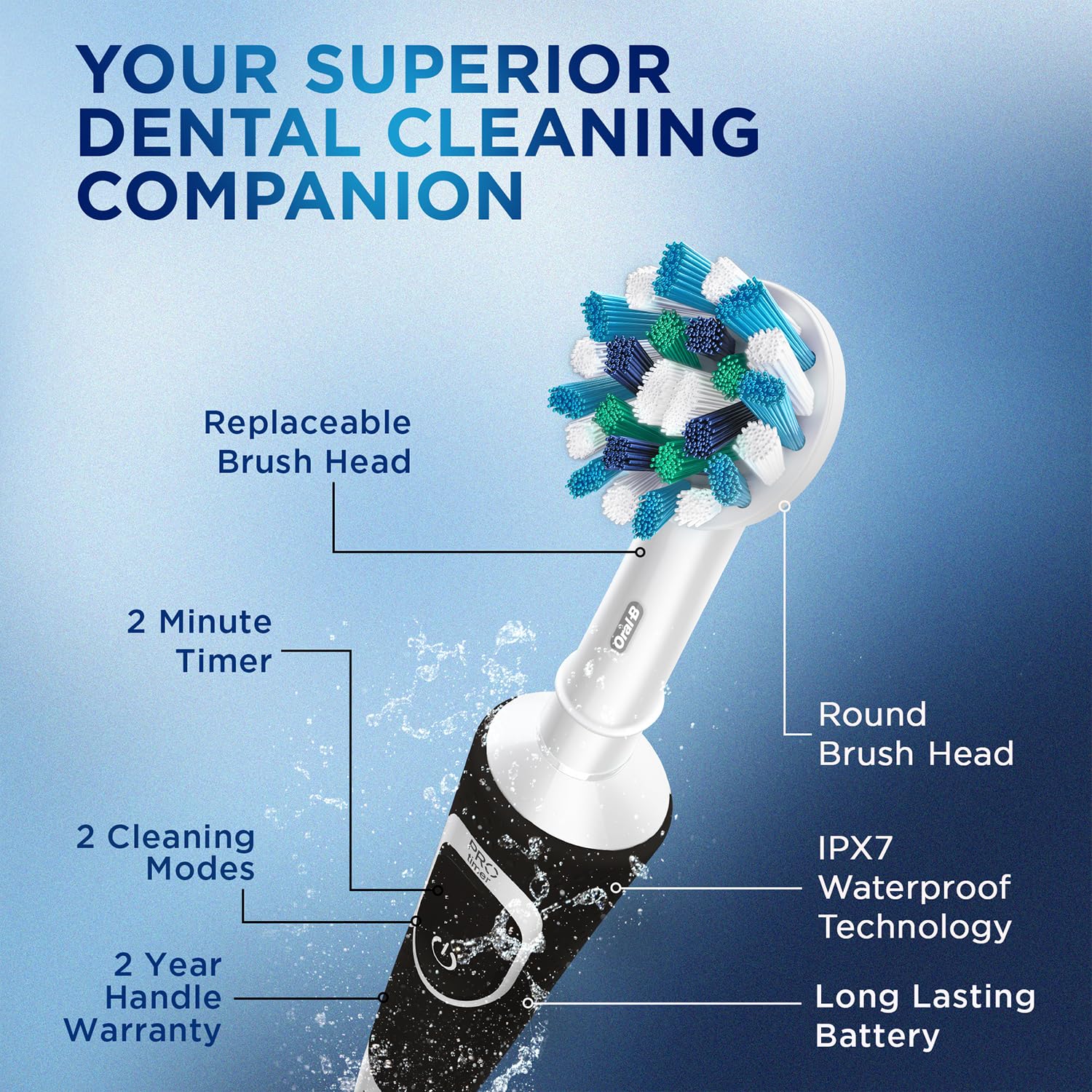 Experience Oral-B VITALITY 100 Black from the 1 brand recommended by dentists worldwide. The VITALITY100 Black electric toothbrush helps you brush like your dentist recommends for 2 minutes with the professional timer and notifies you every 30 seconds to change the area you are brushing. While you are moving the brush around your mouth the Cross Action toothbrush head surrounds each tooth with bristles angled at 16 degrees and 2D cleaning action oscillates and rotates for better plaque removal than a regular manual toothbrush Compatible with the following Oral-B toothbrush heads: CrossAction 3D White Sensi UltraThin Sensitive Clean Precision Clean FlossAction TriZone Dual Clean Power Tip Ortho Care.