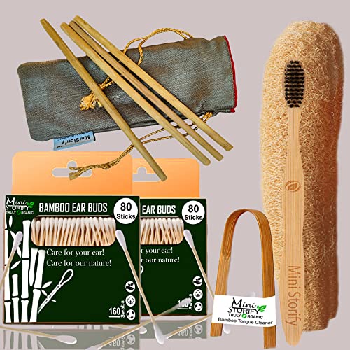 Mini Storify Truly Organic2.Bamboo Cotton ear buds 1. Adult bamboo tooth brush , 1.bamboo Tongue cleaner 2.Loufahs 4. Bamboo Straw (PACK OF 10)