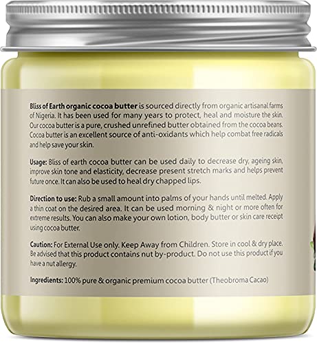 HIGHEST PREMIUM GRADE: Bliss of earth 100% organic Cocoa Butter is therapeutic grade and is best with unrivaled quality. Unlike other Cocoa Butters bliss of earth 100% pure Cocoa Butter is unrefined no added fragrance hexane free preservative free chemica
