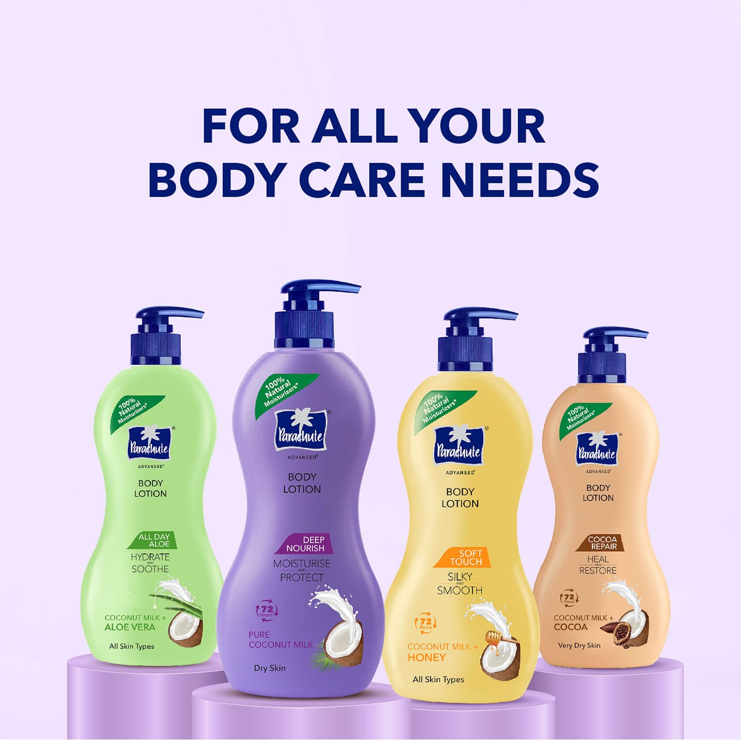 Get naturally beautiful and glowing skin this winter with Parachute Advansed Deep Nourish body lotion for women. This is our original patented formulation especially crafted for extra dry skin. Enriched with goodness of Pure Coconut Milk & 100% Natural moisturizers It provides deep nourishment and intensive moisturization to skin even in the harshest weather. It penetrates 10 layers deep into the skin to restore lost moisture and repair dry and damaged skin. This quick absorbing body lotion has a light non greasy texture that conditions and softens your skin without leaving behind any residue. Its mild fragrance will make you feel refreshed and rejuvenated. Coconut Milk is a miracle ingredient known for its nutritive and transformative effect on skin. It moisturizes and soothes skin from within restoring lost moisture and helps in repair of dry and irritated skin. The entire range of Parachute Advansed Body lotions is derived from nature and contains 100% natural moisturizers. It has been designed especially for Indian skin. Unlike many other body lotions we do not include any ingredients like mineral oil or any petroleum based ingredients (like petroleum Jelly or Liquid paraffin) in our formulation. Our body lotions are safe for Skin and free from silicones sulphates phthalates or any artificial colours. Ideal for extremely dry/very dry skin Suitable for use by both men and women.