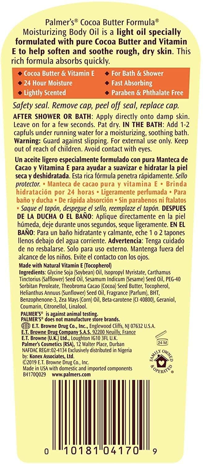 Immerse your skin in a symphony of deep hydration with Palmer's Cocoa Butter Body Oil. Enriched with the goodness of pure cocoa butter and vitamin E. This lightweight fast-absorbing oil deeply nourishes and replenishes your skin without any greasy residue.