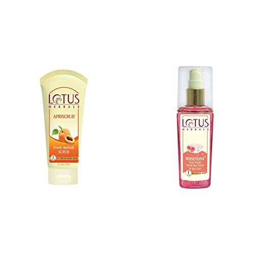 Lotus Herbals Apriscrub Fresh Apricot Scrub 100gTo get a refreshed soft and glowing skin Lotus Herbals Apriscrub Fresh Apricot Scrub is an perfect scrub for all skin types. This is a unisex scrub and refines the skin efficiently. It is enriched with natural ingredients such as Walnut Shells Cetyl Alcohol Elder Flower extracts and Glycerin. It helps to remove the dead cells without affecting your skin.This scrub is effective to provide brighten skin by removing the blackheads from the skin. It cleanses the clogged pores in the skin and restores the moisture. This scrub comes with special oil absorbing and skin softening properties.Background: Suitable for all skin types.Provides fresh skin in just a few minutes. Helps to refine the skin.Efficiently cleans the clogged pores. Helps to remove blackheads from the skin. Removes the dead skin cells. Helps to get glowing and refreshing skin. Formulated with Elder Flower extracts Walnut Shells Glycerin and Cetyl Alcohol. Helps to restore moisture of the skin. Comes with skin softening and oil absorbing properties. Ideal for daily use.Lotus Herbals Rosetone Rose Petals Facial Skin Toner 100mlRefresh Your Skin With Love The stress of a daily routines tires out your skin too. Lotus Herbals Rosetone Rose Petals Facial Skin Toner is designed to rejuvenate your skin and make it look and feel fresh again! Packed with goodness of rose petals this toner not only cleanses your skin of make-up residue but also nourishes and hydrates it. It tightens skin pores preparing your skin for moisturization leaving your skin feeling cared for and pampered. Rose Petals Rose petals control the secretion of excess oils and balance skin PH levels. They have anti-inflammatory properties which soothe irritated skin. They are also loaded with anti-bacterial agents which help heal acne pimples and breakouts. Rose petals are natural moisturizers which hydrate skin to keep it supple. Tulsi Leaves Tulsi Is fortified with antiseptic and purifying qualities which help treat acne pimples and other skin disorders. It helps reduce skin blemishes and lightens skin tone. It helps in removal of dark spots and imparts a natural radiance to your skin. Vetiver Vetiver reduces the appearance of dark spots and blemishes and lightens skin tone. It is rich in antioxidants which protect your skin from damage from external environmental elements and pollutants. It tightens and firms skin making it looker younger and fresher.