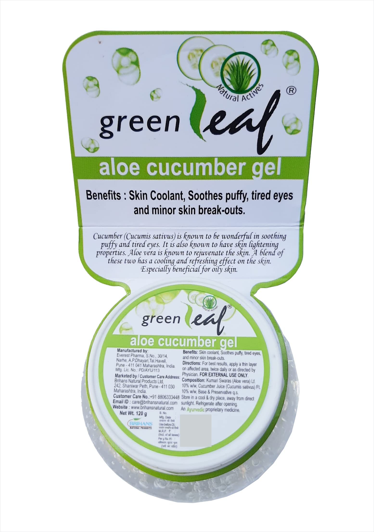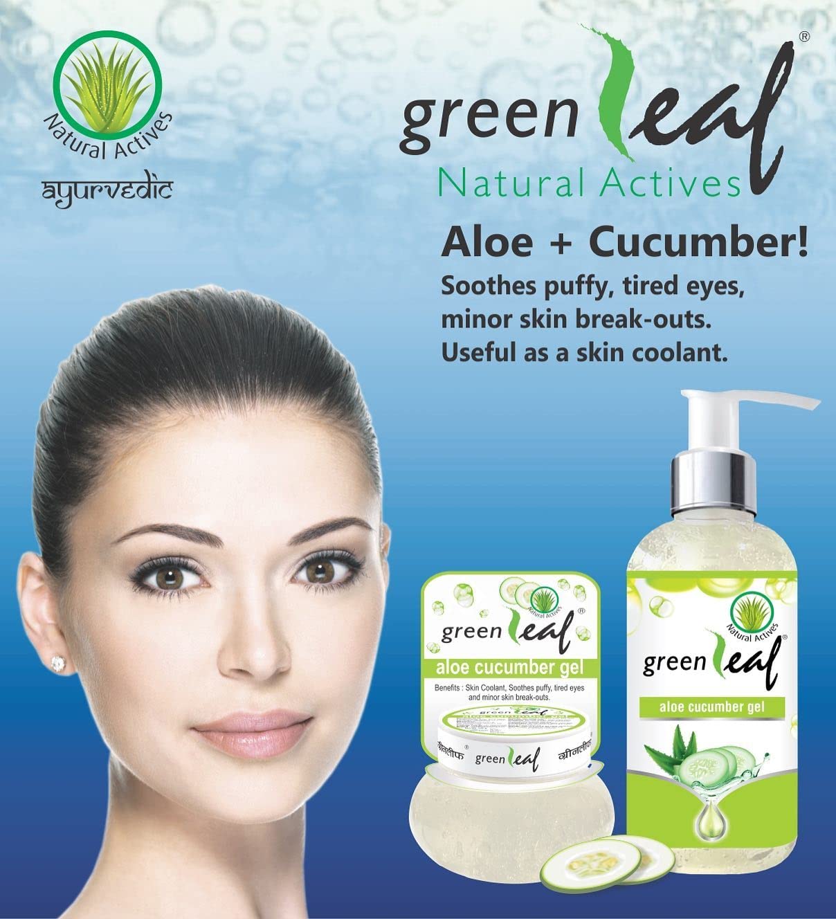 Green Leaf aloe cucumber gel with naturally active cucumber and aloe vera is a powerful aid in treating several under eye problems. Cucumber is known to be wonderful in treating puffy and tired eyes dark circles and freckles (skin lightening) and black heads. Aloe vera is known to rejuvenate the skin. Cucumber and aloe vera are also extremely soothing and impart a cooling effect on skin. Hence this gel works well as a face and skin coolant also. An ayurvedic product with no known side-effects.