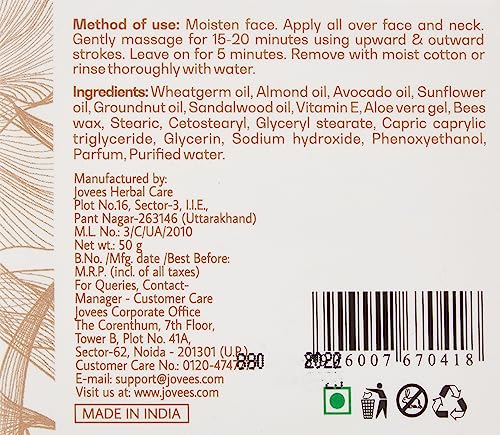 • Method of Use: Moisten face. Apply Jovees face massage cream on face and neck. Gently massage for 15-20 minutes using upward and outward s. Leave on for 5 minutes. Remove with moist cotton or rinse thoroughly with water