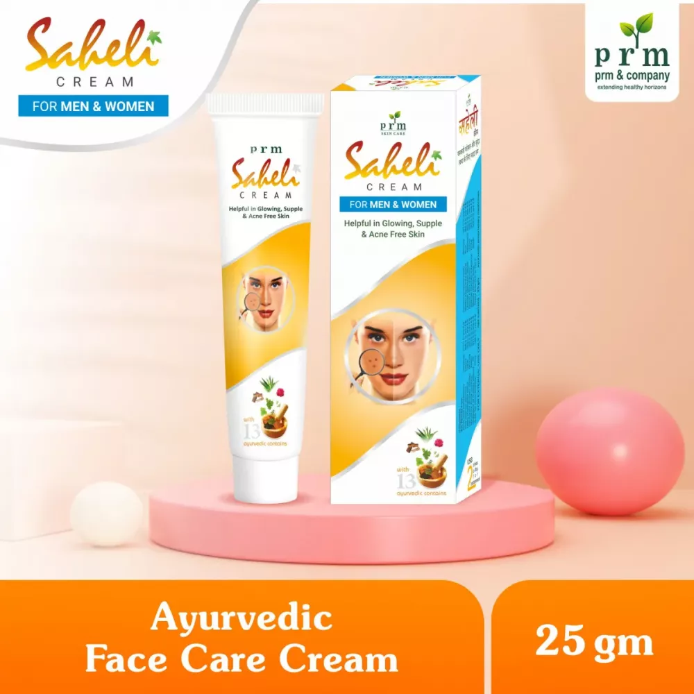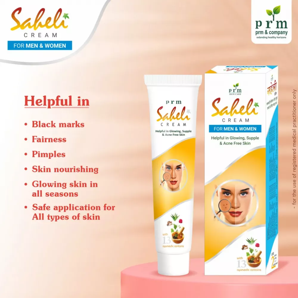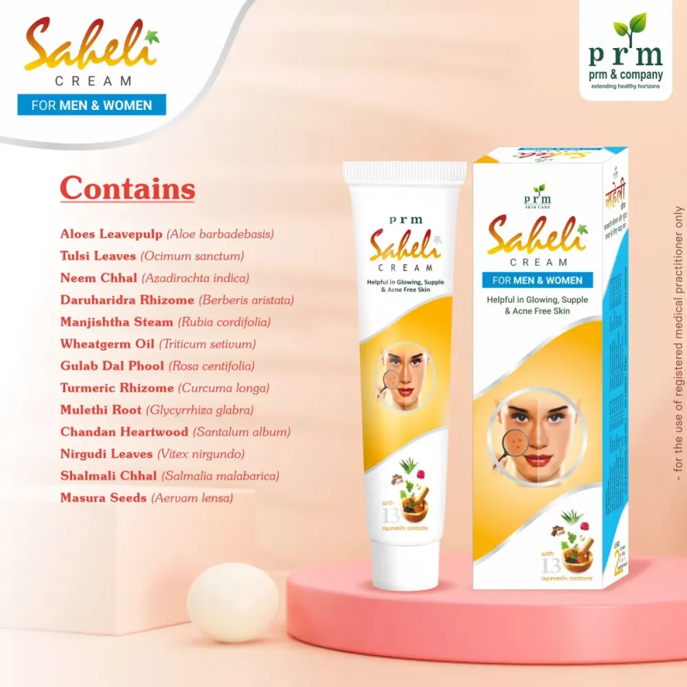 Saheli face cream is a special ayurvedic formulation filled with years of ayurvedic wisdom that has been developed by PRM & COMPANY to give glowing, supple and acne free skin. Saheli cream made with 13 ancient herbs like Aloes, Wheatgerm Oil, Neem, Turmeric, Chandan, Tulsi, Gulabdal and many more