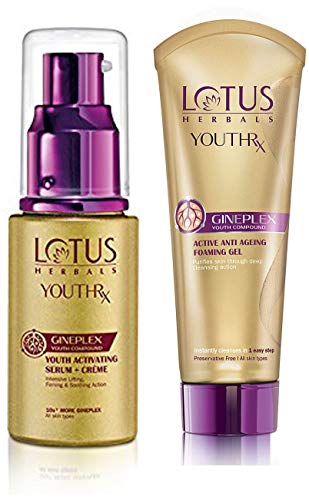 Lotus Herbals YouthRx Youth Activating Serum + Creme 30mlA 2-in-1 youth activation formula for younger looking nourished skinLotus Herbals Youth Rx Youth Activating Serum Plus me is a power-packed natural formula designed to breathe new life into aging skin. Created using the ground breaking ¢Green Science Technology this formulation is ted with Gineplex Youth Compound derived from potent natural ingredients. This anti-wrinkle nourishing formula not only s the appearance of fine lines and wrinkles but also Gineplex Youth Compund is created using the revolutionary ¢Green Science technology. It consists of the potent extracts of: GinsengGinseng is a natural ingredient which increases the regeneration capacity of skin cells making your skin feeling younger more supple and radiant Zingiber Officinale (Ginger) Ginger extracts work naturally on your skin to hypopigmented scars and dark spots and blemishes leaving you with even toned skin that glows. Milk PeptidesMilk peptides nourish your skin from within and aid in the production of collagen which t skin elasticity and infuse it with natural youth and vitality. Benefits of Lotus Herbals Youth Rx Youth Activating Serum Plus me This dual action youth activating serum plus me is designed to have maximum impact right from the first application: Soft younger looking skin This youth activating action formula delivrs 10x Gineplex Youth Compound to the dermal layer of your skin ting production of collagen which improves skin elasticity. Every application hydrates tired skin and ts it with vitality to make it look younger and healthier. Smooth Even Skin ToneThis natural anti-aging moisturizing formula s the appearance of dark spots and blemishes and evens out skin tone to give you a smooth radiant complexion.. Safe for sensitive skinCreated using the ground breaking ¢Green Science Technology the Gineplex Youth Compound used in the unique formulation of this anti-wrinkle anti-aging me is derived from potent natural ingredients making this product safe even for sensitive skin. Lotus Herbals YouthRx Active Anti Ageing Foaming Gel 100gReveal younger looking skin with every washLotus Herbals Youth Rx Active Anti-Ageing Foaming gel takes years off your skin. Created using ground breaking ¢Green Science technology this anti-wrinkle foaming gel contains Gineplex Youth Compound formulated using active natural ingredients. This unique formula nourishes and moisturizes dull tired looking skin while gently cleansing it of the dirt and grime. This natural anti-ageing fix comes in a compact easy-to-use tube which makes it convenient to carry it everywhere. Gineplex Youth CompoundGineplex Youth Compund is created using the revolutionary ¢Green Science technology. It consists of the potent extracts of: GinsengGinseng is a natural ingredient which increases the regeneration capacity of skin cells making your skin feeling younger more supple and radiantZingiber Officinale (Ginger) Ginger extracts work naturally on your skin to hypopigmented scars and dark spots and blemishes leaving you with even toned skin that glows. Milk PeptidesMilk peptides nourish your skin from within and aid in the production of collagen which t skin elasticity and infuse it with natural youth and vitality. Wipe off the years off your skin with every washLotus Herbals Active Anti-Ageing Foaming Gel not only hydrates your skin while cleansing it but also improves skin elasticity and s wrinkles and fine lines to make your skin appear fresher and younger. Clean smooth and glowing skin The active ingredient of this anti-ageing foaming gel gently cleans even sensitive skin. Its unique formula s the size of the pores and removes dark spots and blemishes to give you even toned smooth glowing skin with every wash. fine lines and wrinklesThe natural ingredients used in the formulation of this moisturizing anti-wrinkle foaming gel t the production of collagen which improves skin elasticity and s the appearance of fine lines and wrinkles making your skin visibly younger and healthier. Safe for sensitive skinCreated using the ground breaking ¢Green Science Technology the Gineplex Youth Compound used in the unique formulation of this anti-wrinkle anti-aging foaming gel is derived from potent natural ingredients making this product safe even for sensitive skin.