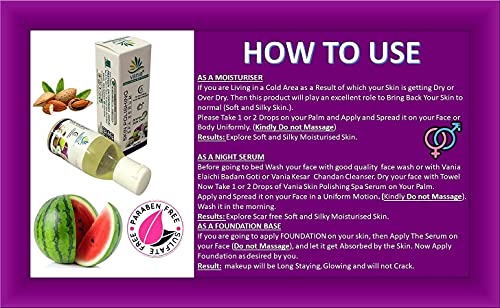 Best Skin friendly serum at affordable price I love Vania products and buy every product they launch for my beauty saloon. This time I have choosen this serum from their basket and addicted due ti following reasons : ?This serum is very Economical and quality wise it is better than other leading intermatiinal brands. ?There is no miracle happened but when we are mixing it with Vania SPA Cream ,Glow on the Skin has been increased to 210 %. ?Skin becomes buttery,silky and Shiney. ?Make up shinning is increasing when we are using before make up or as a make up base. ?Removes dryness instantly as Vania people claim. ? Fragrance seems to pure Aroma ? Non greesy and non sticky is an added advantage ? Ultimate polishing when apllied to whole body ?. One drop challange marked on the produxt is 100 % Right. ? Purly paisa vasool prosuct ?Easy to carry very helpful in extreme cold areas I have tried it in Ladhakh. ? This serum is the best Skin care product. must buy it.My son is 5 years old and he is also using it