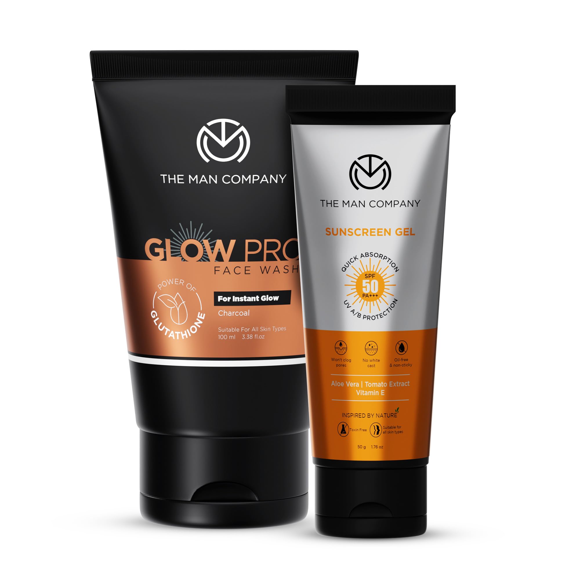 The Man Company Oil-Free Sunscreen Gel SPF 50 PA+++ & Glow Pro Face Wash for Deep Cleansing - Cleanse & Protect Combo | Non-Sticky, Evens Skin Tone | For Normal to Oily Skin