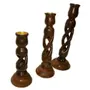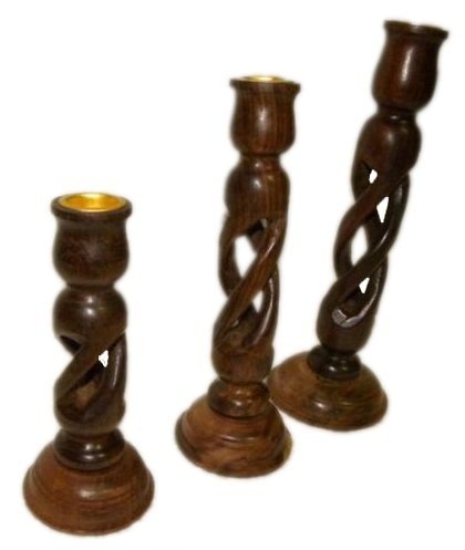 The beauty of this piece lies in the carving done on wood and the colors & cone art done on the surface. The twists & turns in wood add elegance to this candle holder set. Makes for a beautiful christmas gift. "Wooden Candle Stand made from high quality wood. Set of 3 candle stands.Color :Brown Material : Wood Size : 6810 inch Care Instruction : Clean with a dry cloth"