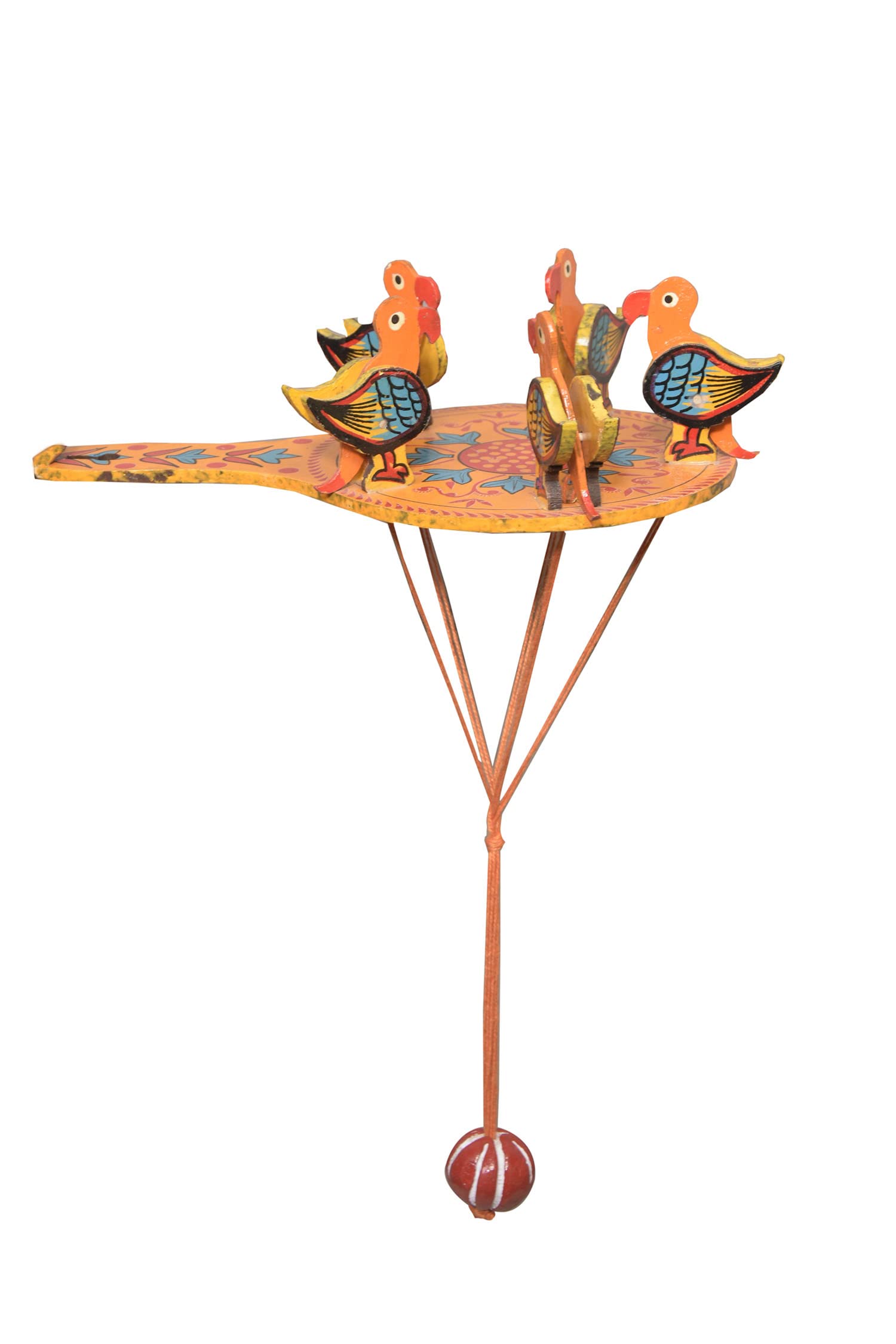 VARANASI WOODEN TOYS five birds pecking toy in made up of wood. These traditional toys. Are painted by vibrant colour. It has hanging weight which pulls the bird neck and it looks like the birds are pecking grains. These intricately hand chiselled and hand crafted toy will sure bring smile to the Rids and toddlers. It doesnt have any sharp edges so it in fully safe for kids. This century old toy is a pride possession. It trying to and keep the tradition alive.