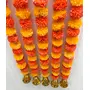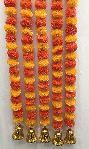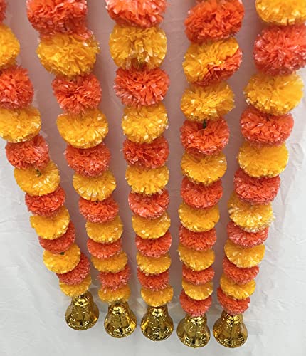 Festive Vibes Artificial Marigold Fluffy Flowers and Golden/Silver Hanging Bells Garlands/Torans/Wall hangings for Decoration Approx 5 ft- Pack of 5 Strings (Light & Dark Orange)