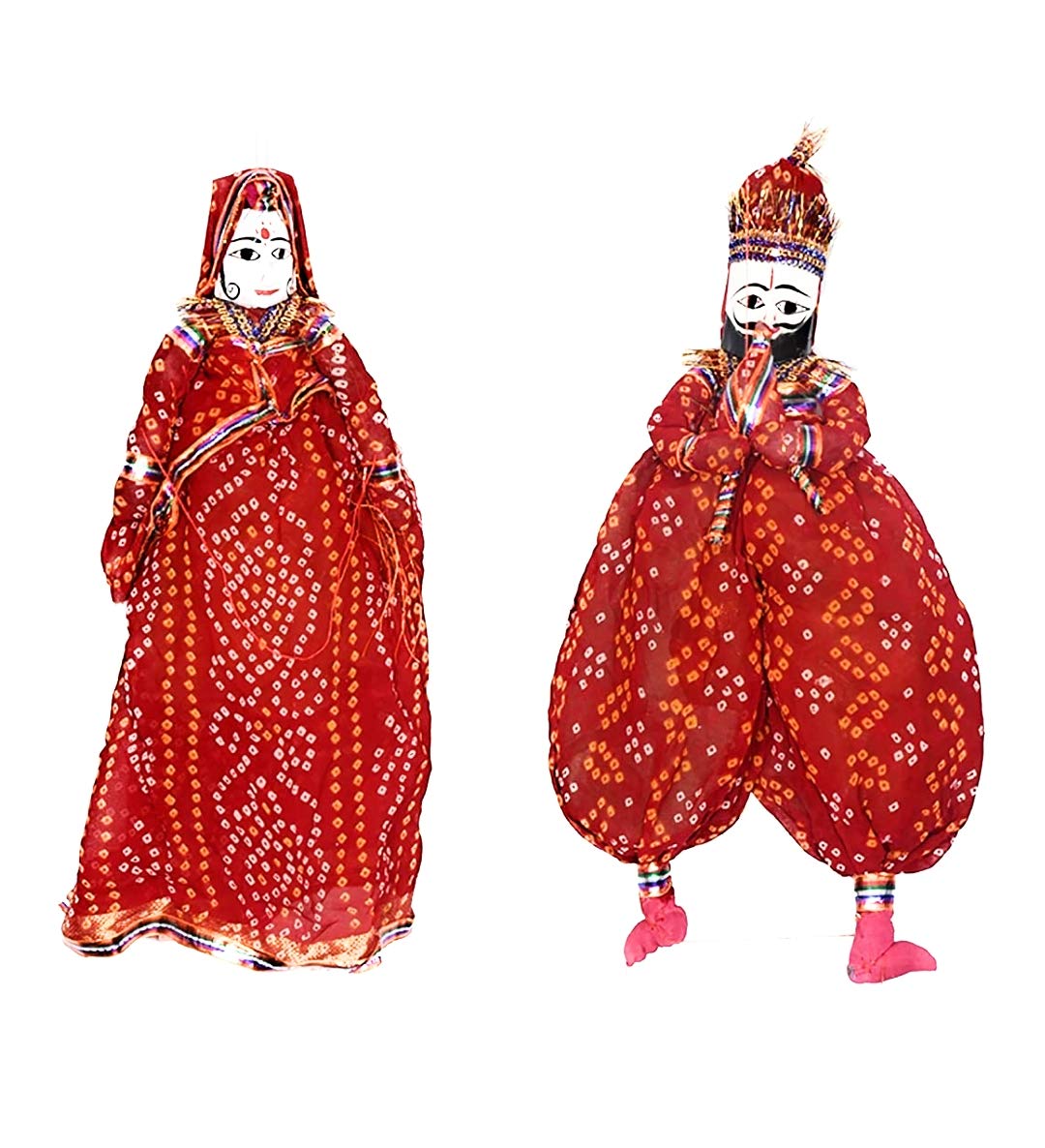About Brand: RAJASTHANI PUPPETS is a rapidly emerging brand in Indian contemporary market. With an increase in Indias youth for the likeness of Indian Rajasthani Handicrafts & Antiques Bandhani clothes. Our brand has made a significant remark among Art Lovers. Our Philosophy is to bring together the world with the skilled craftsmen in remote India and doing everything in best possible way to get the unique art to the Buyer. Modern life is busy but never forget to slow down your pace and relax yourself our handicraft & furniture are the best medium to do so. About Product: RAJASTHANI PUPPETS Rajasthani Puppets (Kathputli) is a string puppet native to Rajasthan and is an ancient and well-known form of folk entertainment it is controlled by a single string. Kathputli is a join of two rajasthani language words Kath meaning wood and Putli meaning a doll which has no life. Kathputli means a puppet which is made entirely from wood. However it is made out of wood cotton cloth and metal wire. The string puppets of Rajasthan are famous as kathputhlis in the local language and the main centres where they are prepared are Jaipur and Jodhpur. SPECIFICATION -Speciality: Rajasthani -Material: Cotton Cloth & Painted wooden face -Type: Cultural string Puppets -Size: Men: height 20" Women: height 18 -Weight: 150gm. -Colour: Red -Best use: Hang using strings given. Use in cultural events gathering and theme parties. It can also be used for Home dcor. -Package Content: 1 pair of String Puppet; includes 1 male and 1 female puppet CARE INSTRUCTIONS: Dont dip in water dust with dry cloth and clean with damp cloth. DISCLAIMER: 1. Actual Color may vary from those shown in Images due to screen color settings of device. 2. There may be difference in size by 1" to 2"Inches. Disclaimer - Puppets are made of recycled/ waste cloth and waste wood material and our poor artisans give the traditional shape by the use of recycled/ waste cloth and waste wood.