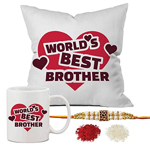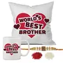 Christmas Vibes World's Best Brother Rakhi Gift Hamper Combo - 4pc (1 Cushion 1 Mug 1 Pearl Rakhi and Roli Chawal) Rakhi Gift for Brother Rakshabandhan Gift Rakhi Gift for Bhai