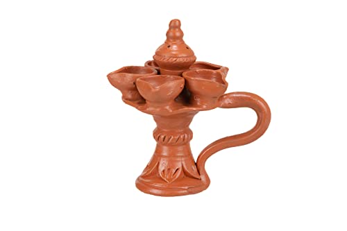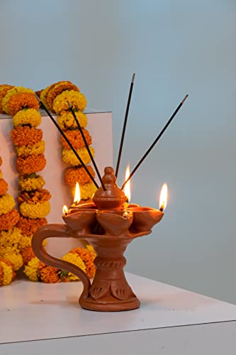 Karru Krafft Wheel Thrown Terracotta Stand Panch Diya with Handle and Incense Stick Holder for Pooja Decor Navaratri Decor Diwali Lighting Diwali Gifting Home Decor