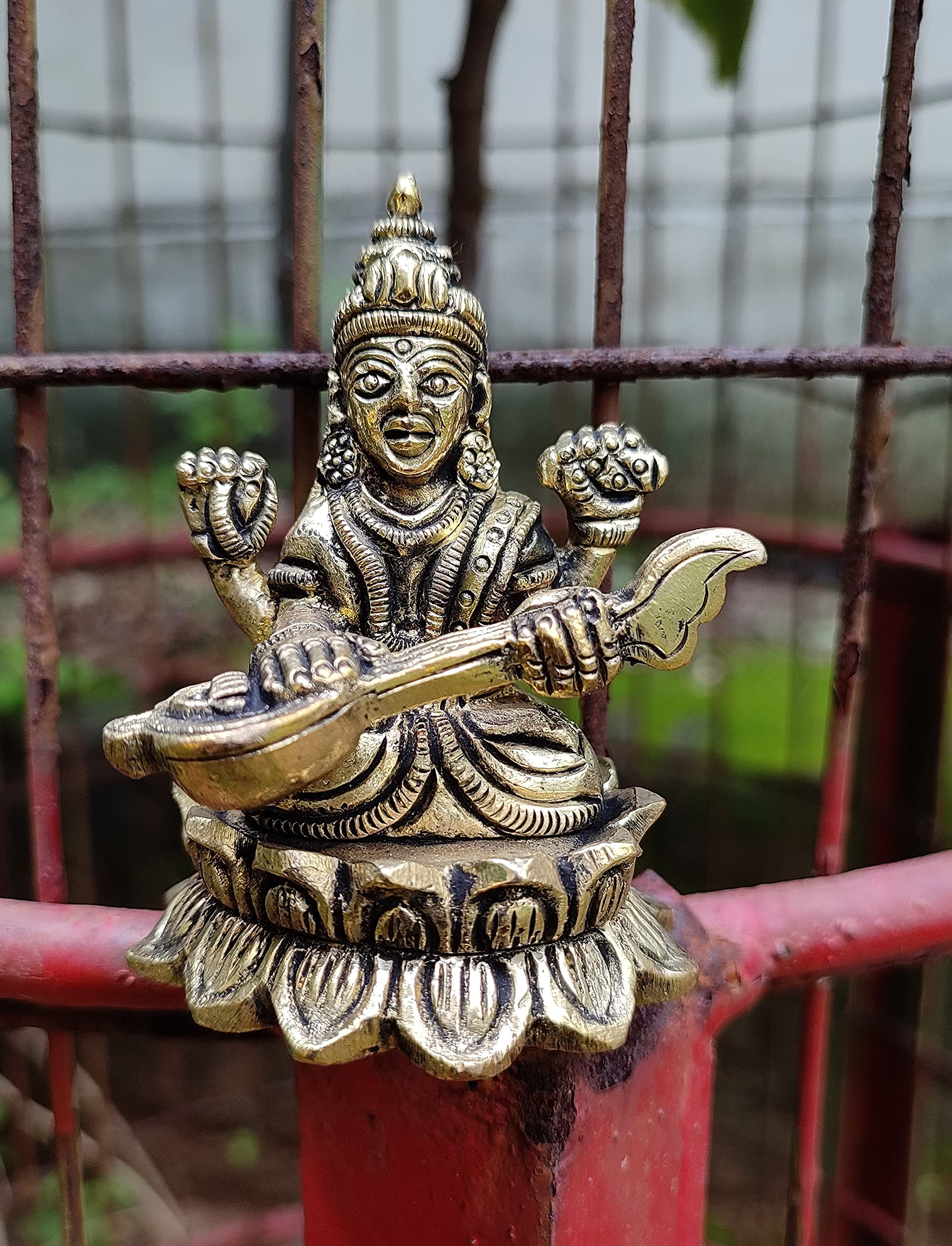 Bharat Haat has been in the industry for two decades now. We are a manufacturer of Brass decorative products and export our products to other countries as well.We design develop and manufacture solid brass products such as home décor Pooja products living room and art décor products.Our quality is what we are known for. We do not compromise our product quality. We have an in-house team who manages all our design aspects and work closely with the current trend.Size: 5.08 x 4.06 x 7.36 cm (L x W x H); 2 x 1.6 x 2.9 Inch (L x W x H)Package Contain: 1 x Saraswati Ji Sitting on Kamal Small