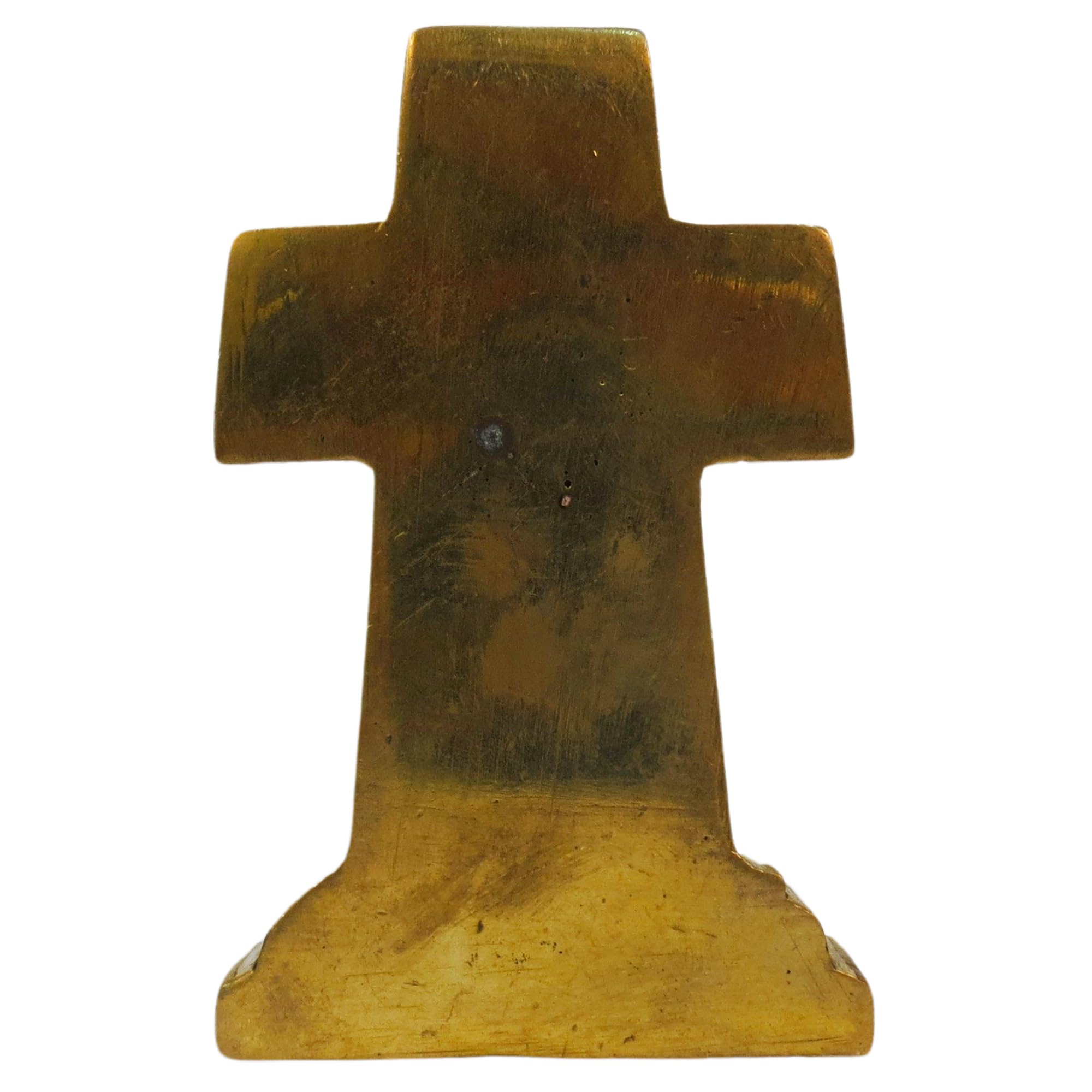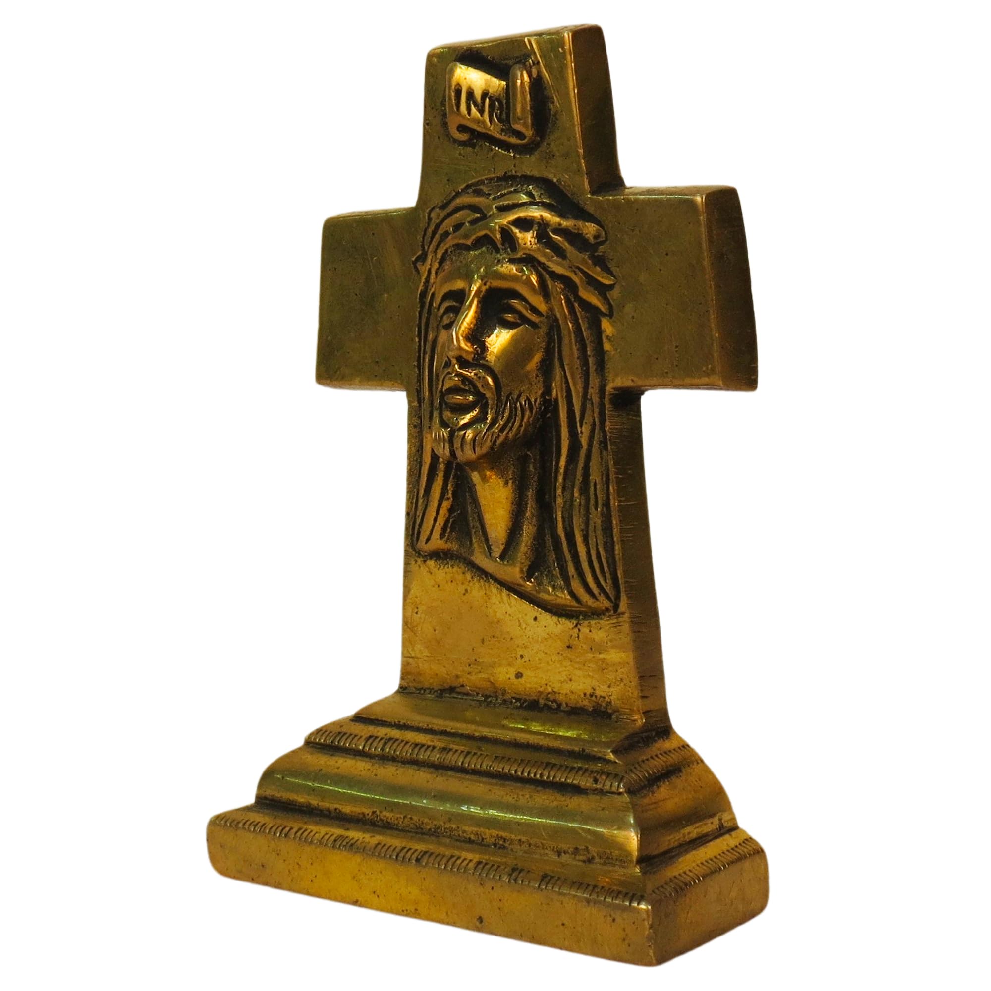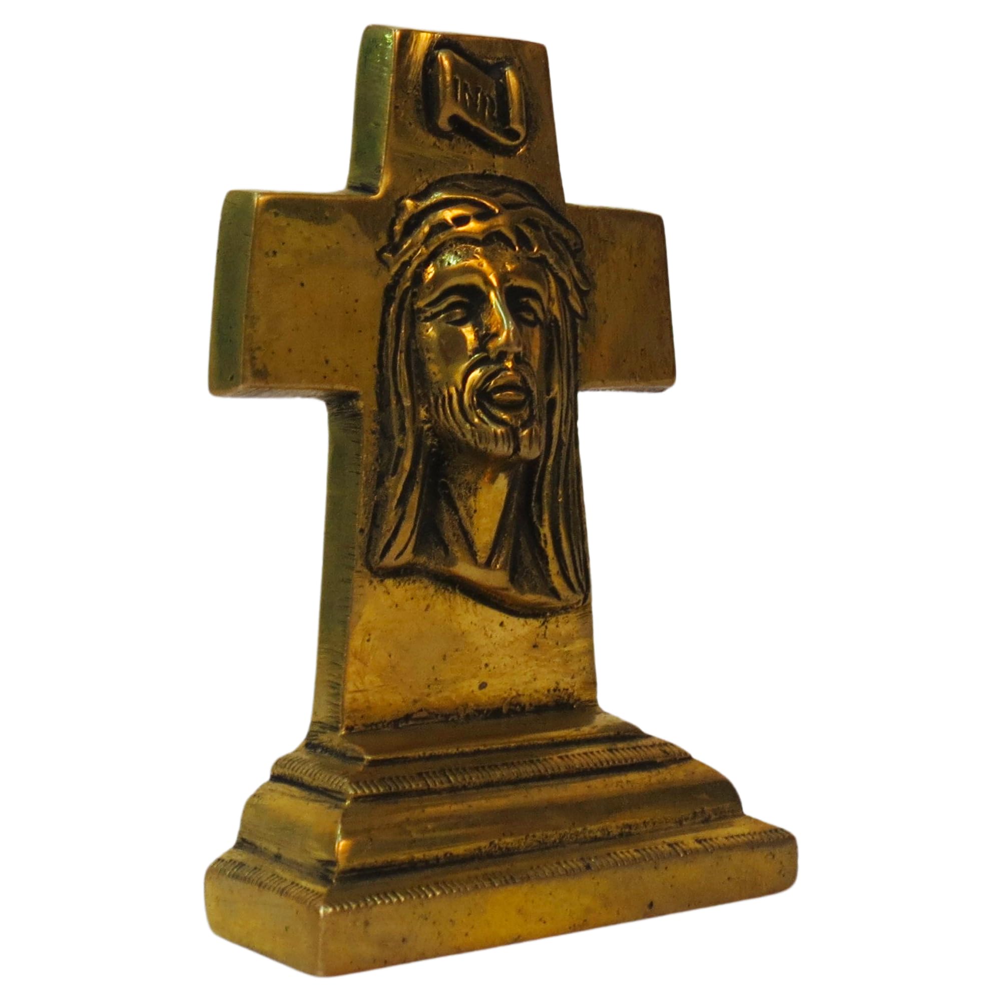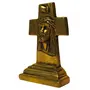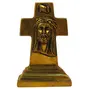 Kalarambh Brass Cross Idol Lord Jesus face solid decorative showpiece 4.2 inchA brass cross idol depicting the face of Lord Jesus would likely be a religious artifact crafted with care and reverence. Here's a description based on common expectations:Solid brass giving it a durable and lustrous appearance.