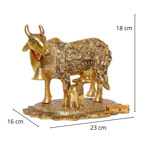 KridayKraft- We brings you an unique antiques religious kamdhenu cow with calf standing on metal base. The product is Gold plated with antique finish so looks very beautiful and use for the purpose of worship and for home decorative. It's design to looks traditional stylish and inspiration from the day's of royal touch that is made in metal casting with antiques finish Metal to bring elegance to your home. This is handmade handcrafted items use it to religious worship of god goddess. That is use and utility items & an ideals gift it to your dear ones to pass on your best wishes that is an ideal gift for have warming anniversaries birthday wedding gifts return gifts corporation gifts religious-gifts & Indian festivals.