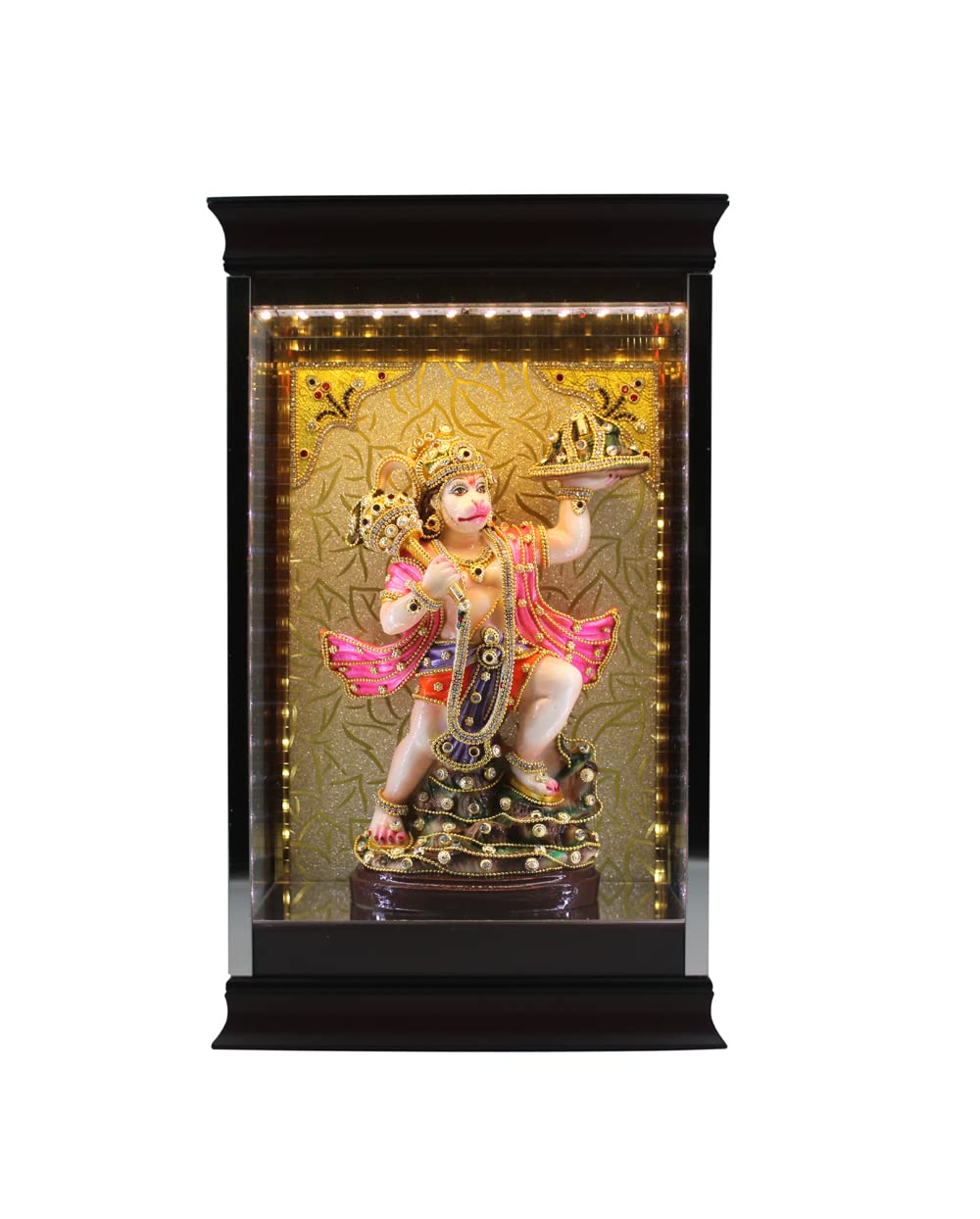 STONE WORK Presented Two In One Product One Is A Beauiful Sculpture And Second One Is A Desiner Acrylic Cabinet With Beautiful Background Graffic With Golden And White luminescent LED lights with external power supply for easy repair and replacement With 12V AC Dietachable Adaptor.This Cabinet Base material is high density water resistant sturdy boards and its unlike partical boards giving extra strength and durability above all longivityImported Acrylic Cabinet BoxCabinet Covered 3 Side With Magnificent Transparent Glass (visibility Is To Good).Its Best For Table Top Decoration In Puja RoomLiving Room Or Bed Room
